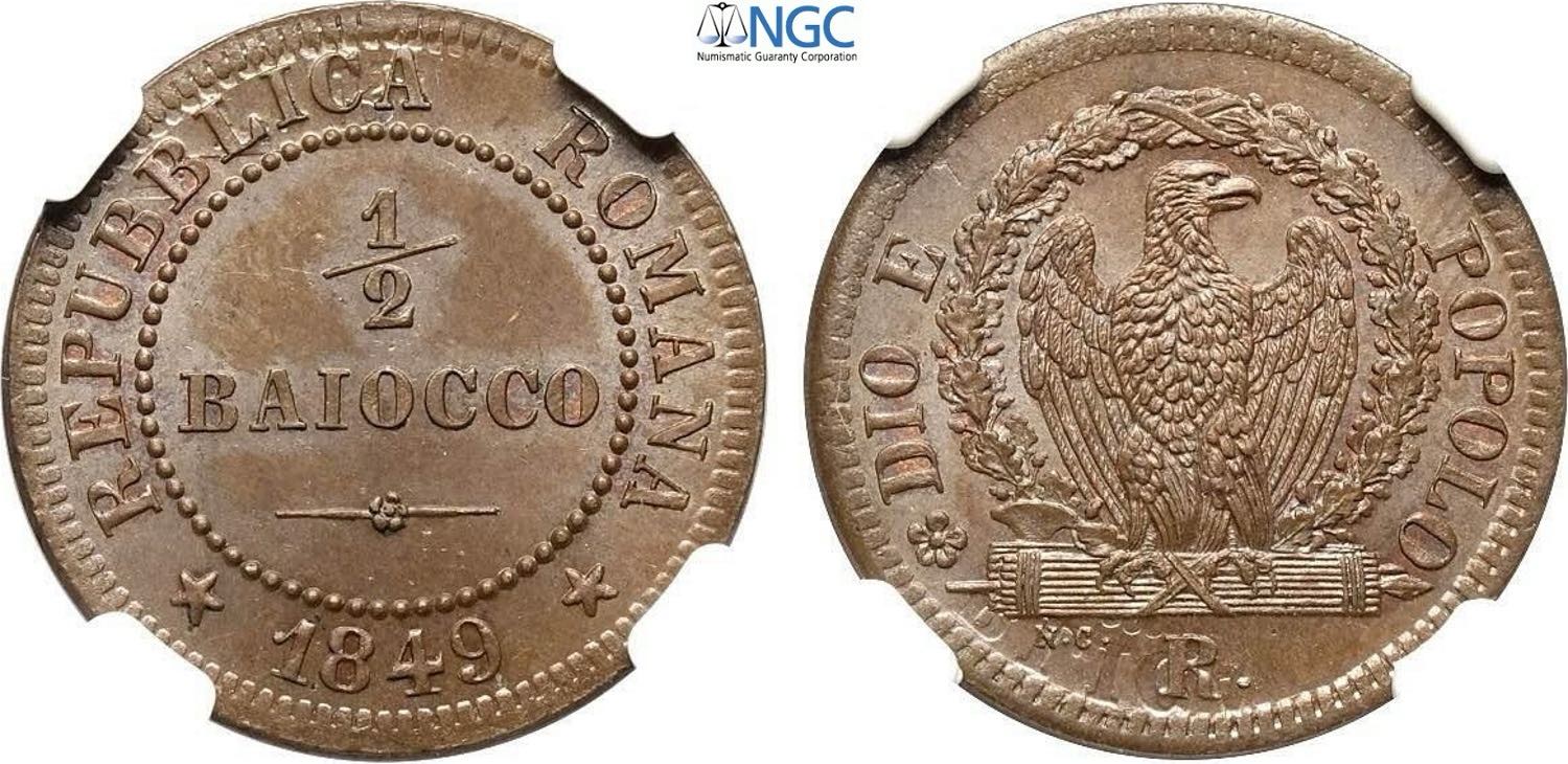 Roma, Repubblica Romana (1848-1849), Mezzo Baiocco 1849-R, Roma, Cu 24 mm 5 g, ex asta Aurora 25 lotto 256, eccezionale, in Slab NGC MS65 ...