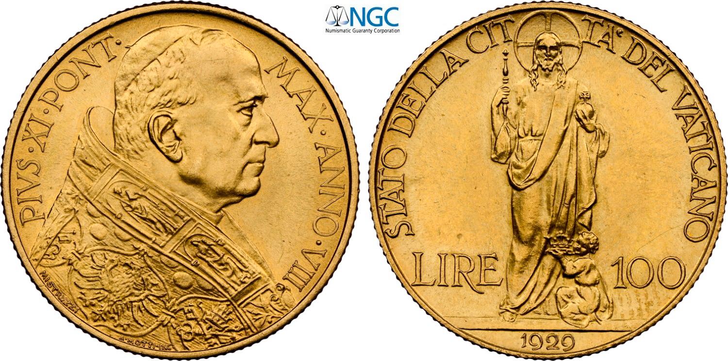 Città del Vaticano, Pio XI (1929-1938), 100 Lire 1929, Au 23,5 mm 8,80 g. in Slab NGC MS63