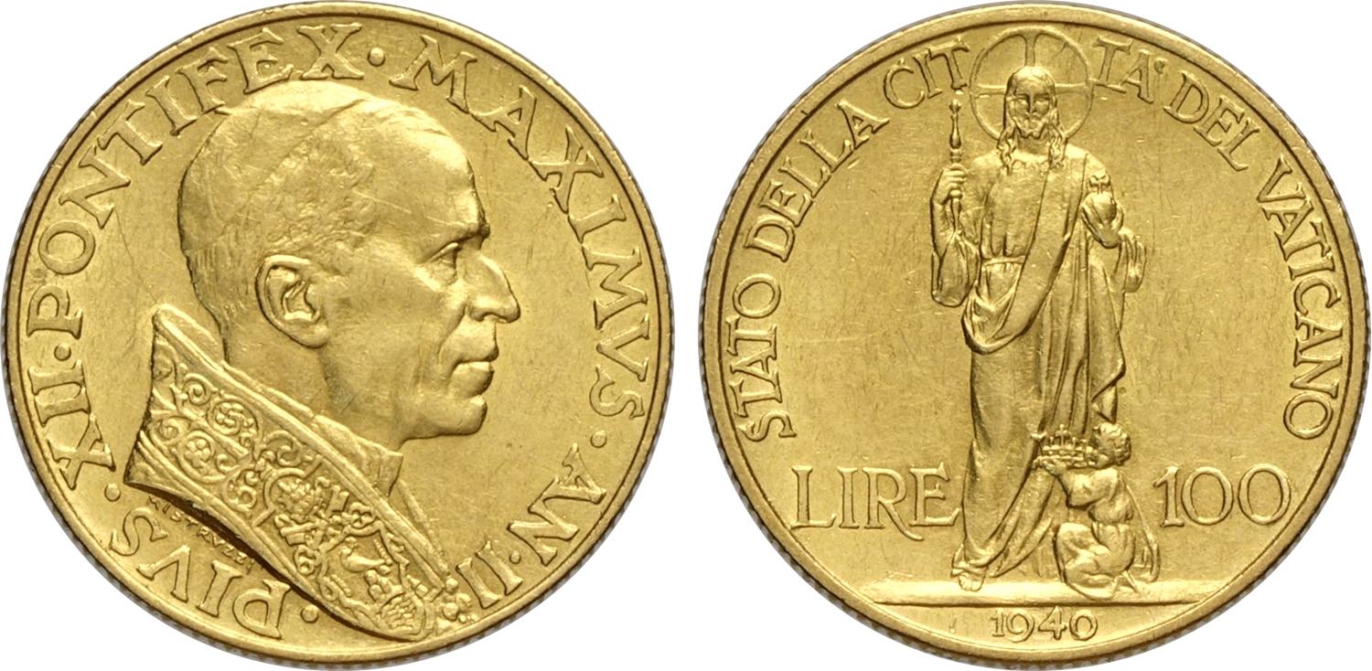 Città del Vaticano, Pio XII (1939-1958), 100 Lire 1940, Tiratura: 2000, Rara Au 20,7 mm 5,19 g. SPL