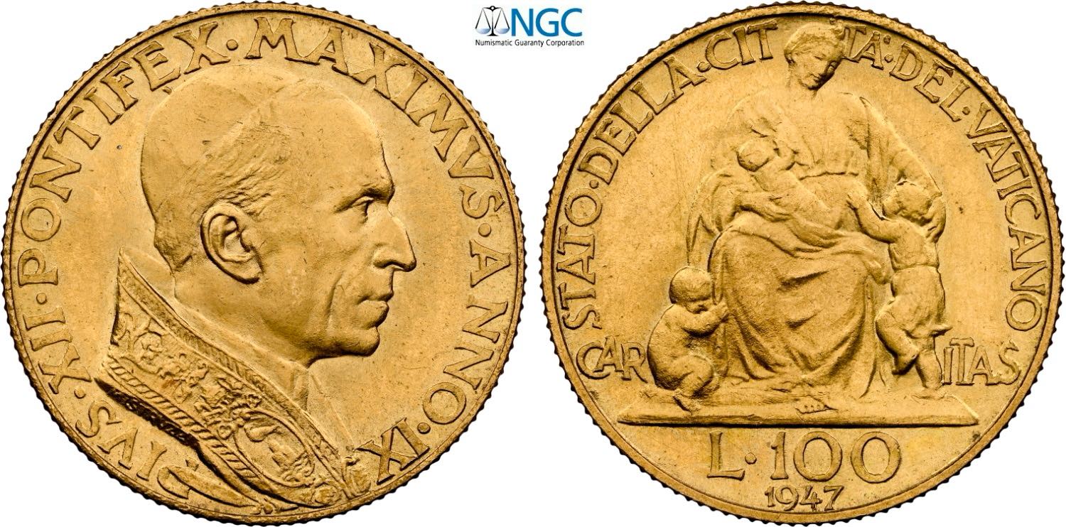 Città del Vaticano, Pio XI (1929-1938), 100 Lire 1947, Tiratura: 1000, RR Au 20,7 mm 5,19 g. in Slab NGC MS65