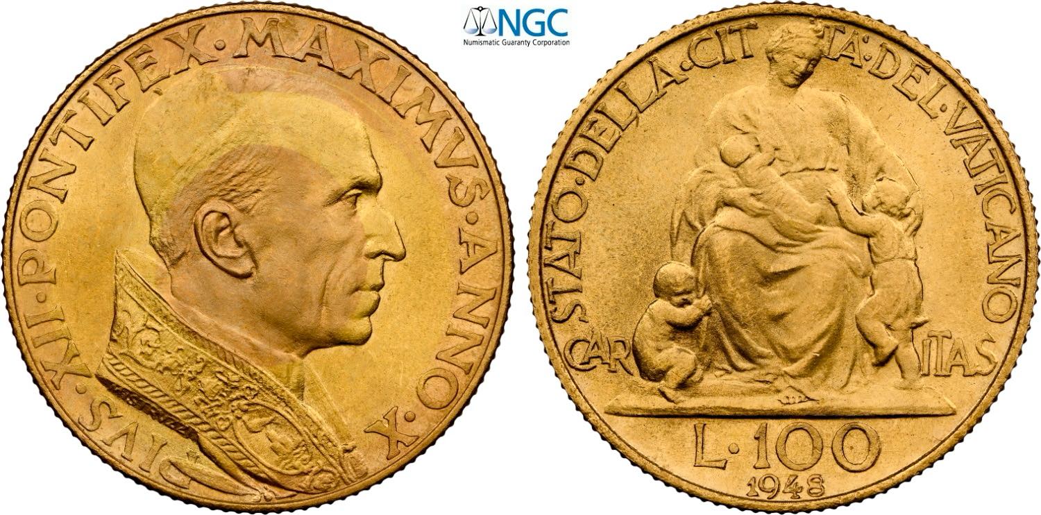 Città del Vaticano, Pio XI (1929-1938), 100 Lire 1948, Tiratura: 3000, Rara Au 20,7 mm 5,19 g. in Slab NGC MS64