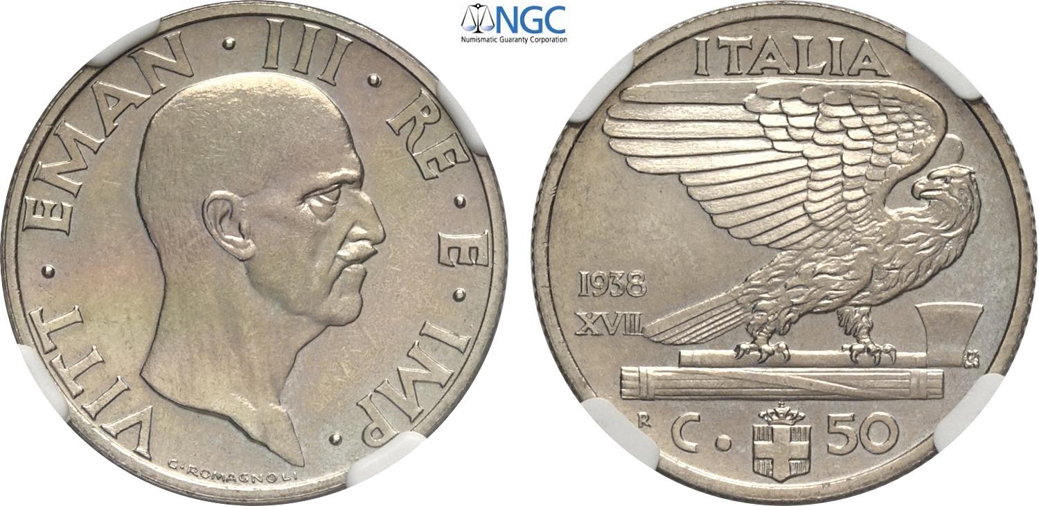 Regno d'Italia, Vittorio Emanuele III (1900-1943), 50 Centesimi 1938, Tiratura: 20, RRRR Ni 23,8 mm, 6 g, in Slab NGC MS65 (only 1 coin is ...