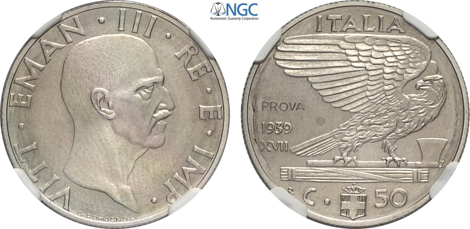 Regno d'Italia, Vittorio Emanuele III (1900-1943), 50 Centesimi 1939-XVII Prova, RRRR Ni 24,1 mm, 6 g, in Slab NGC MS65