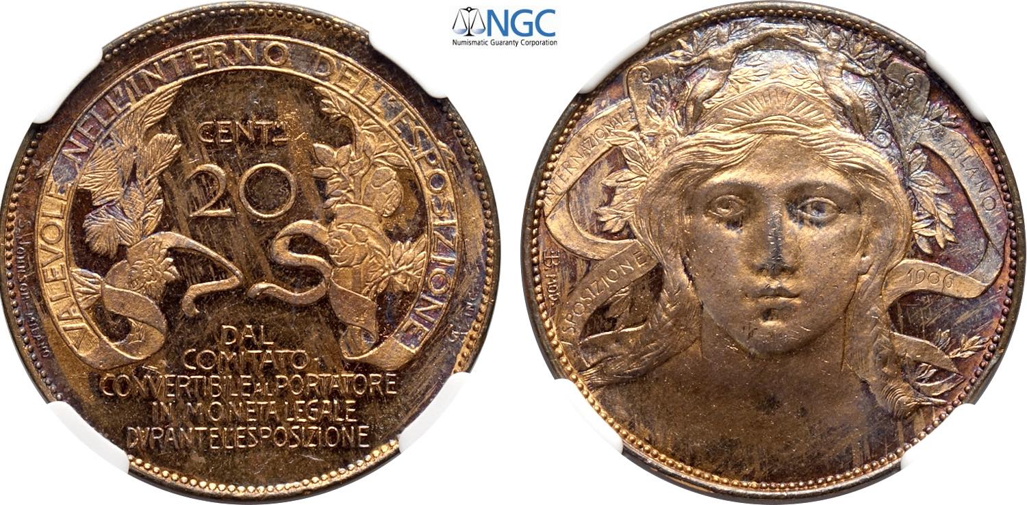 Regno d'Italia, Vittorio Emanuele III (1900-1943), Buono da 20 Centesimi 1906 per l'Esposizione di Milano, Cu 28 mm, 9,5 g, in Slab NGC ...