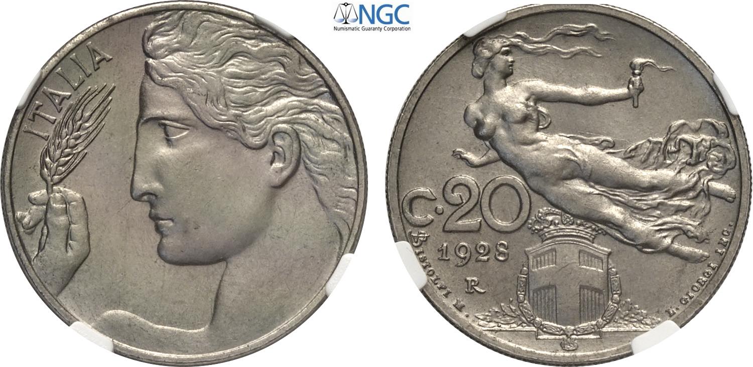 Regno d'Italia, Vittorio Emanuele III (1900-1943), 20 Centesimi 1928, Tiratura: 50, RRR Ni 21,5 mm, 4 g, in Slab NGC MS65 (only 1 coin is ...
