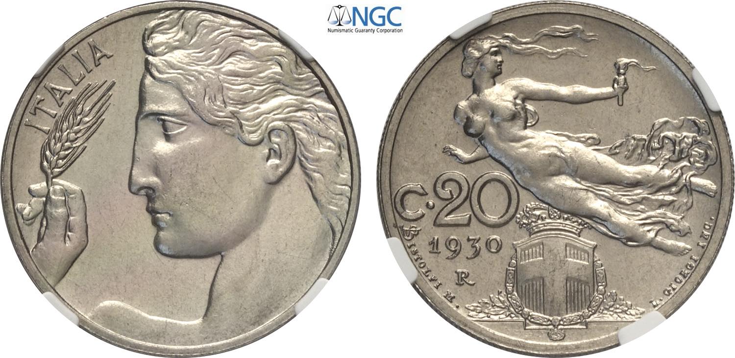 Regno d'Italia, Vittorio Emanuele III (1900-1943), 20 Centesimi 1930, Tiratura: 50, RRR Ni 21,5 mm, 4 g, in Slab NGC MS65