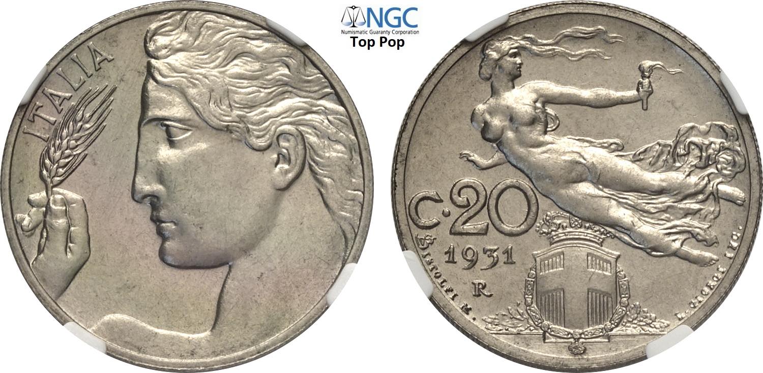 Regno d'Italia, Vittorio Emanuele III (1900-1943), 20 Centesimi 1931, Tiratura: 50, RRR Ni 21,5 mm, 4 g, in Slab NGC MS65 Top Pop (cert. ...