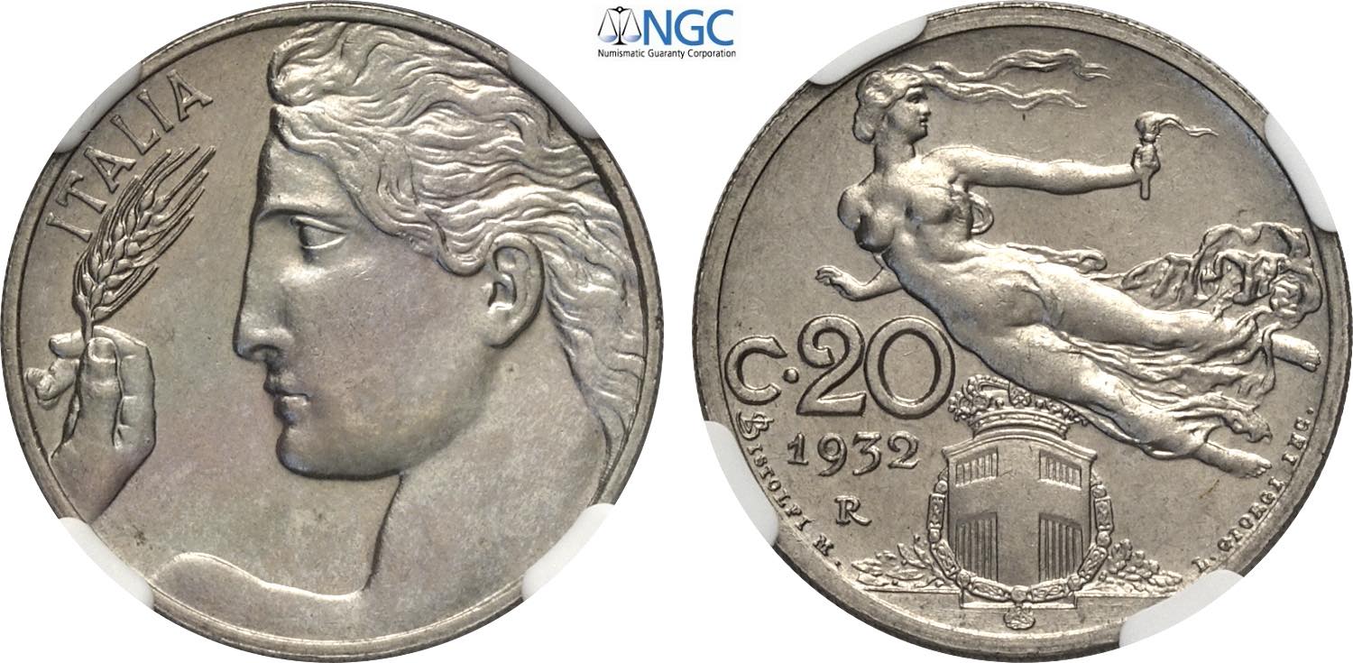 Regno d'Italia, Vittorio Emanuele III (1900-1943), 20 Centesimi 1932, Tiratura: 50, RRR Ni 21,5 mm, 4 g, in Slab NGC MS64