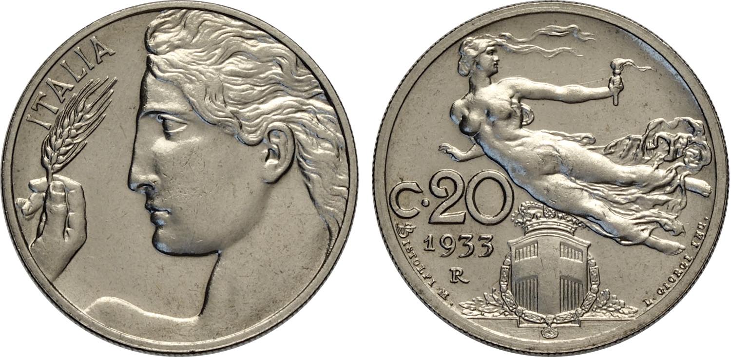 Regno d'Italia, Vittorio Emanuele III (1900-1943), 20 Centesimi 1933, Tiratura: 50, RRR Ni 21,5 mm, 4 g, FDC