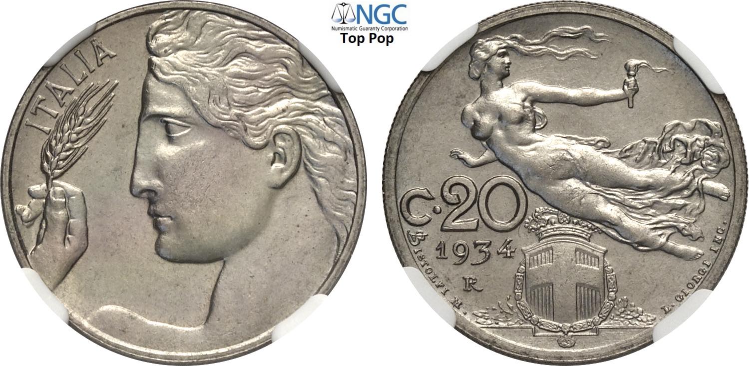 Regno d'Italia, Vittorio Emanuele III (1900-1943), 20 Centesimi 1934, Tiratura: 50, RRR Ni 21,5 mm, 4 g, in Slab NGC MS65 Top Pop (cert. ...