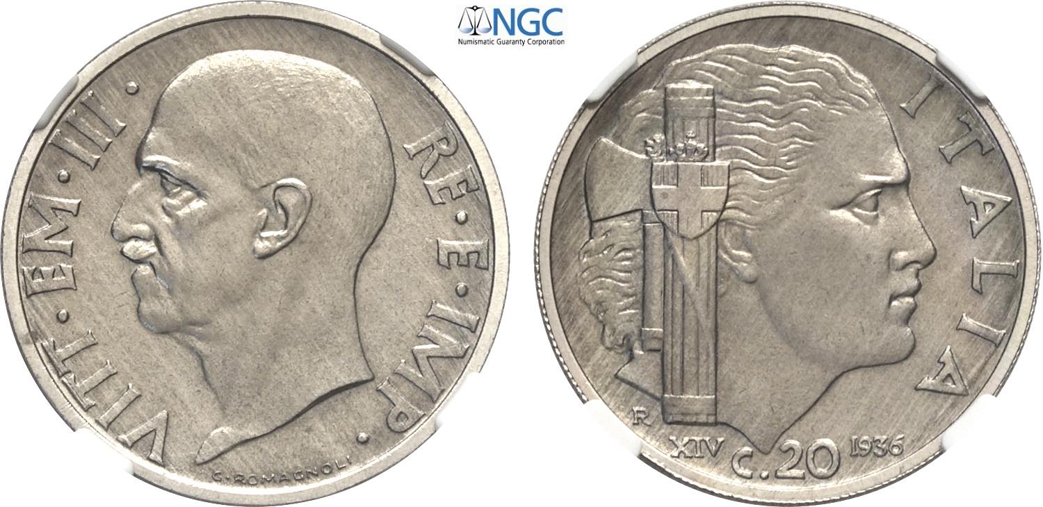 Regno d'Italia, Vittorio Emanuele III (1900-1943), 20 Centesimi 1936, RR Ni 21,5 mm, 4 g, eccezionale, in Slab NGC MS66