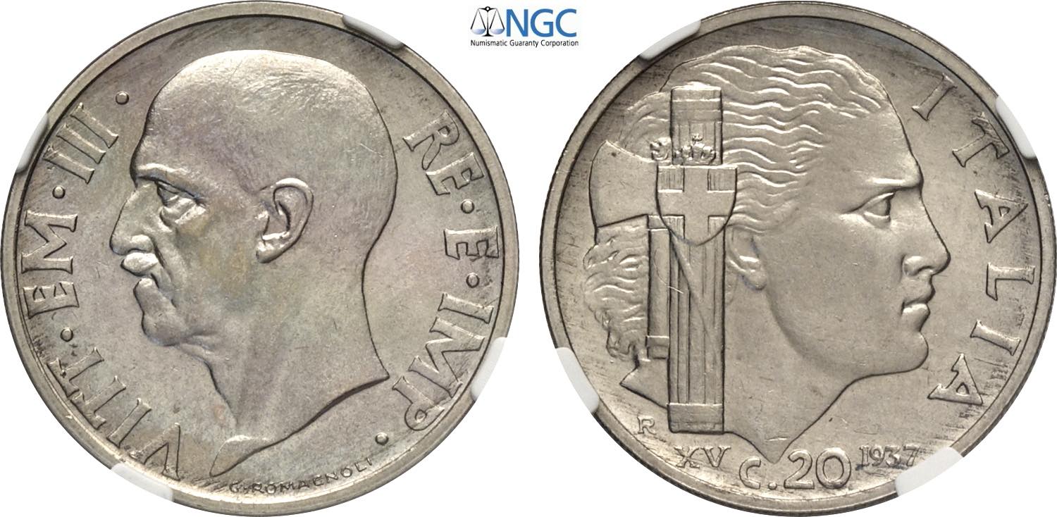 Regno d'Italia, Vittorio Emanuele III (1900-1943), 20 Centesimi 1937, Tiratura: 50, RRR Ni 21,5 mm, 4 g, in Slab NGC MS65