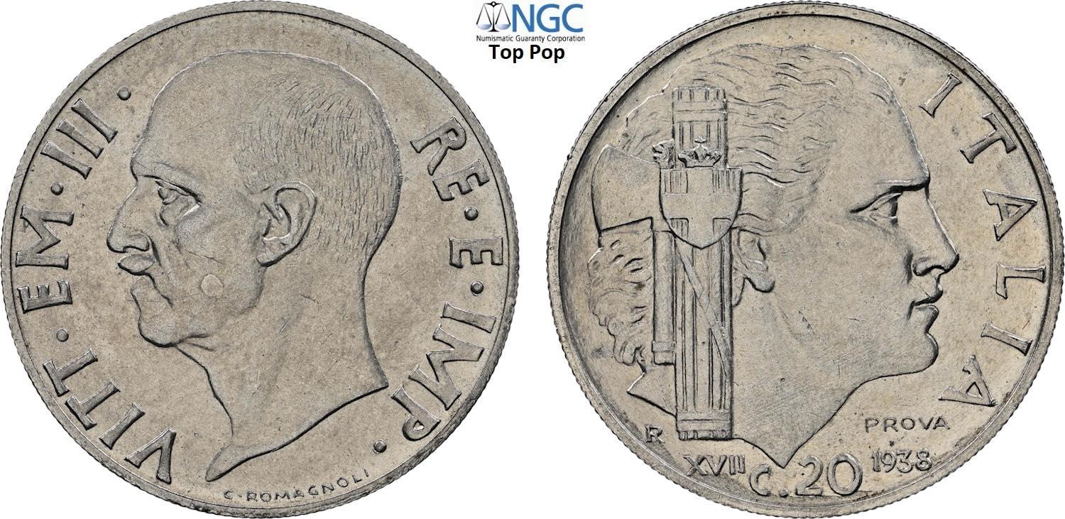 Regno d'Italia, Vittorio Emanuele III (1900-1943), 20 Centesimi 1938 Prova, RRRRR Ni 21,5 mm, 4 g, di massima rarità, in Slab NGC MS64 Top ...