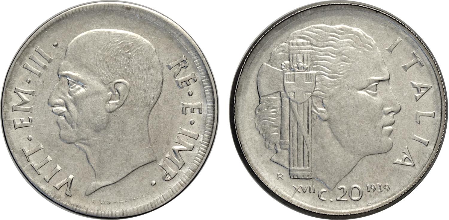 Regno d'Italia, Vittorio Emanuele III (1900-1943), 20 Centesimi 1939-XVII amagnetico, bordo largo e contorno liscio, RRRR 23,5 mm, 3,95 g, ...