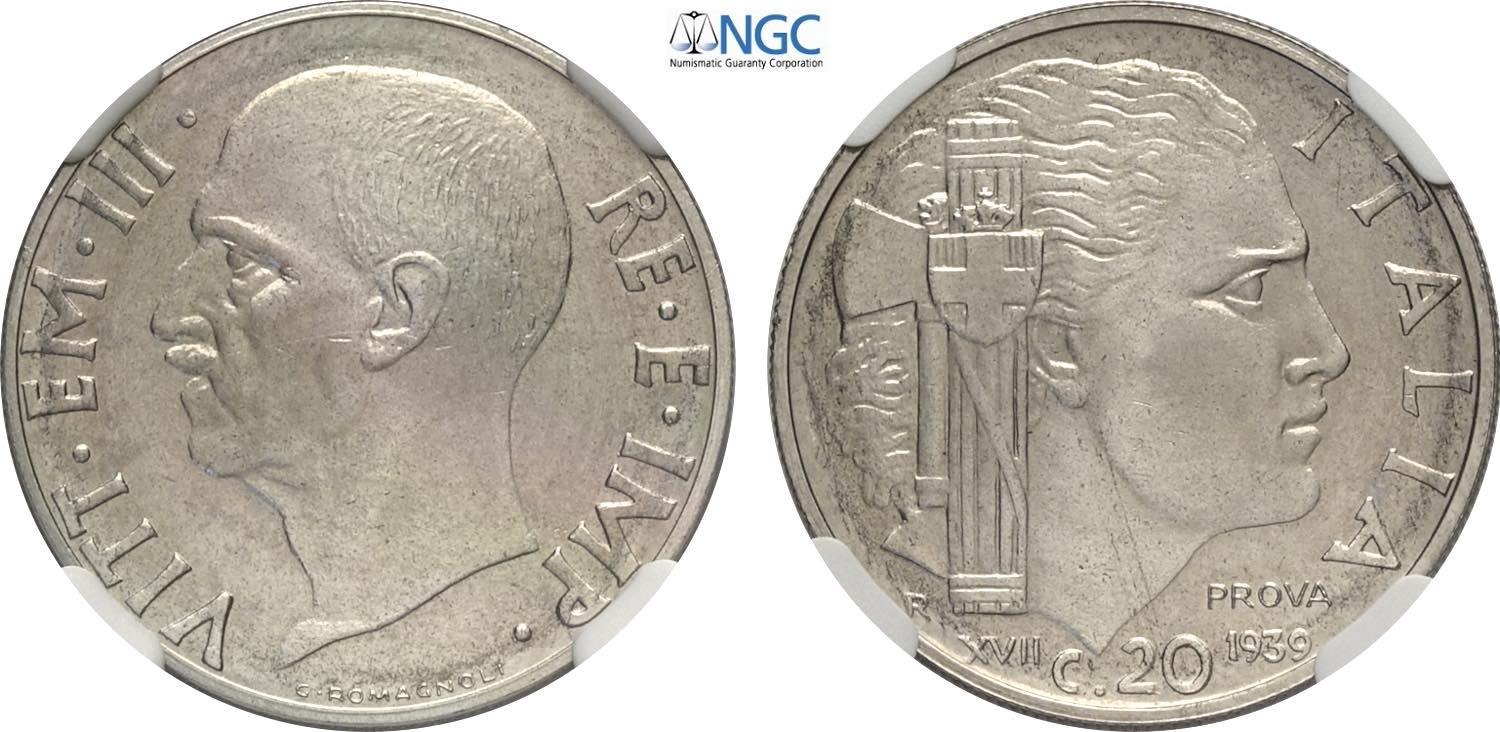 Regno d'Italia, Vittorio Emanuele III (1900-1943), 20 Centesimi 1939-XVII Prova, RRRR Ac 21,7 mm, 4 g, in Slab NGC MS65
