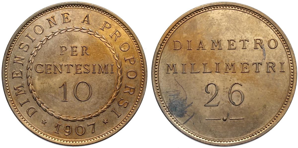 Regno d'Italia, Vittorio Emanuele III (1900-1943), 10 Centesimi 1907 progetto in rame, Rara Pag-322, Cu 26 mm, 6,06 g, con cartellino ...