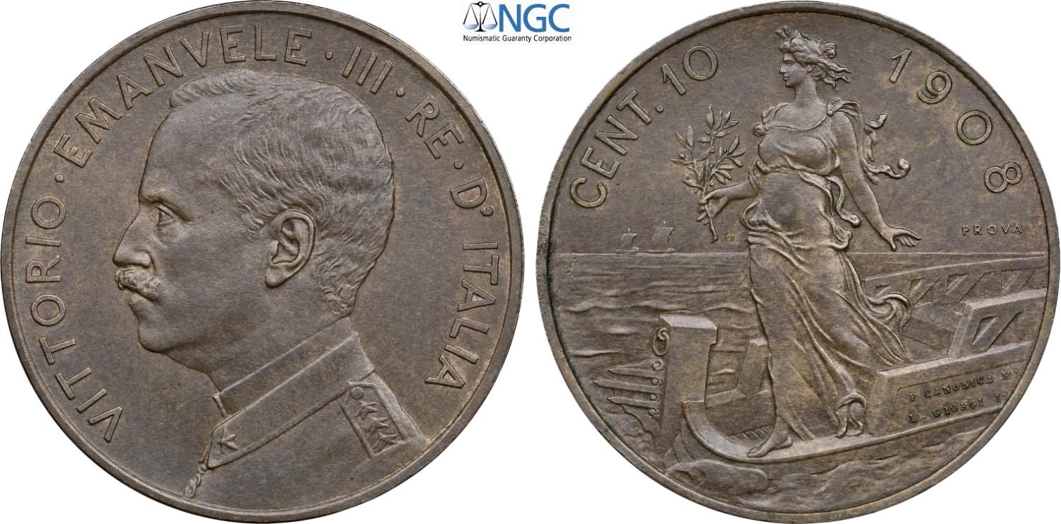 Regno d'Italia, Vittorio Emanuele III (1900-1943), 10 Centesimi 1908 Prova, Pag-323 RRR Cu 30 mm, 10 g, in Slab NGC MS62 BN