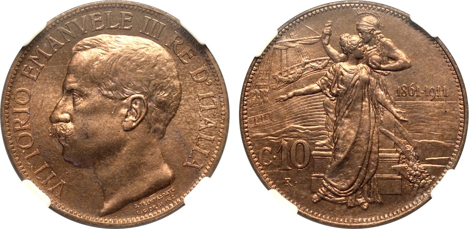 Regno d'Italia, Vittorio Emanuele III (1900-1943), 10 Centesimi 1911, Cu 30 mm, 10 g, eccezionale in rame rosso, FDC
