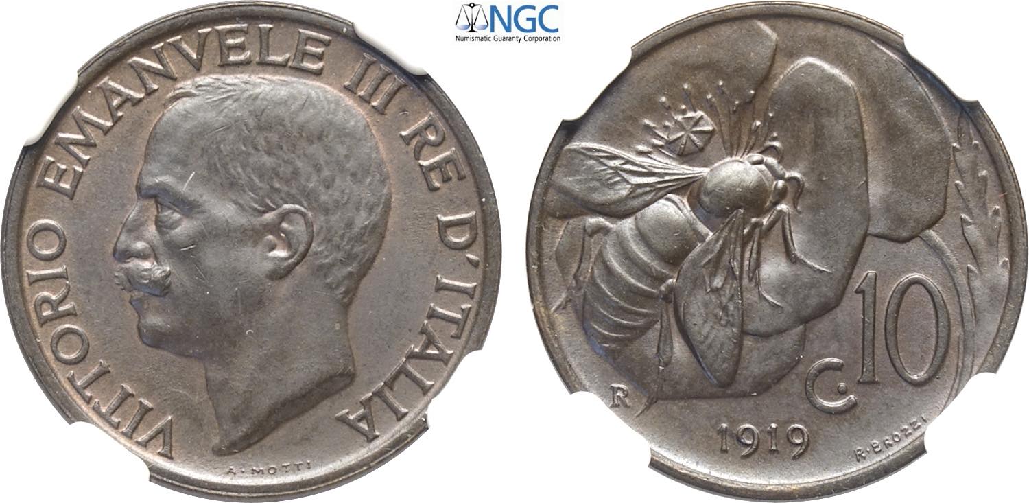 Regno d'Italia, Vittorio Emanuele III (1900-1943), 10 Centesimi 1919, Cu 22,5 mm, 5,4 g, conservazione inusuale, in Slab NGC MS65 BN (only ...