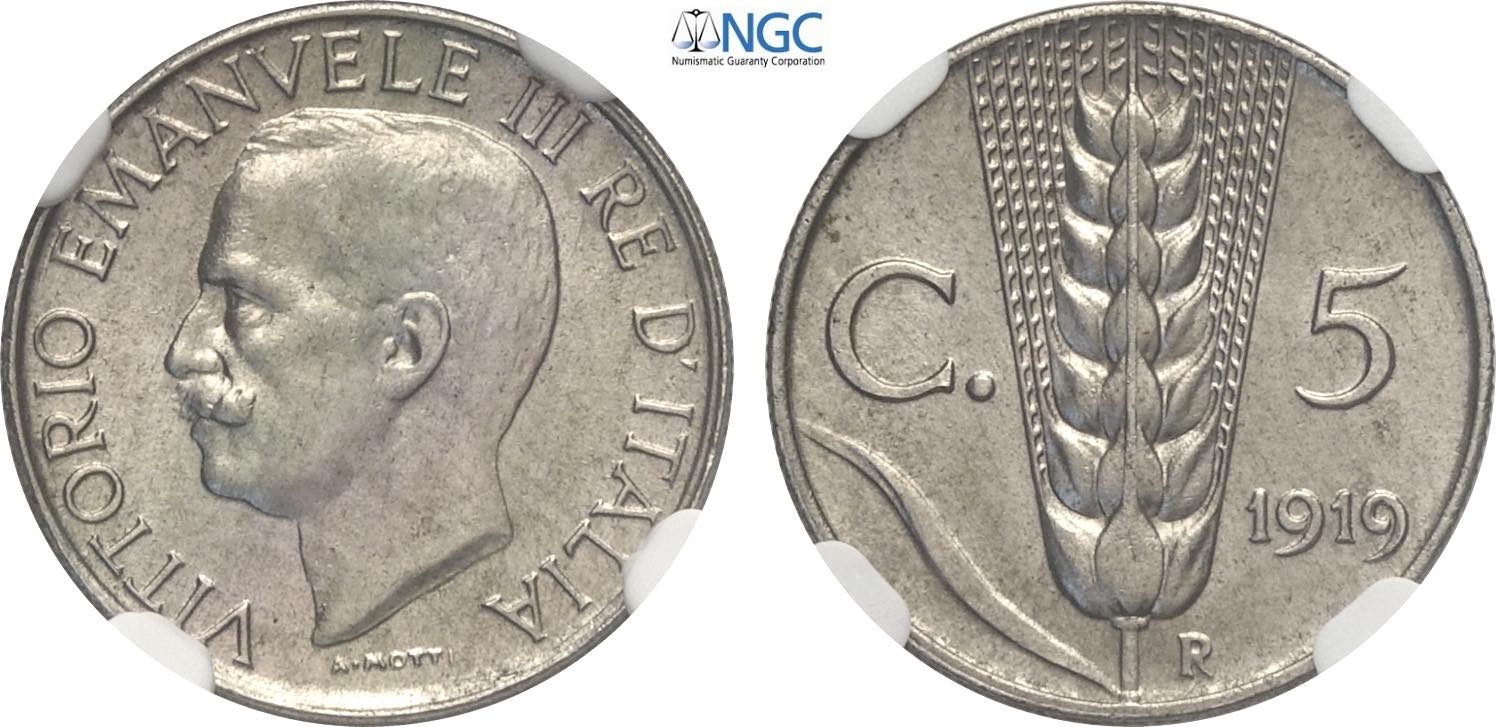 Regno d'Italia, Vittorio Emanuele III (1900-1943), 5 Centesimi 1919 Prova, Rara Pag-373 Fe-Ni 17 mm 2 g, in Slab NGC MS65 (only 1 coin is ...