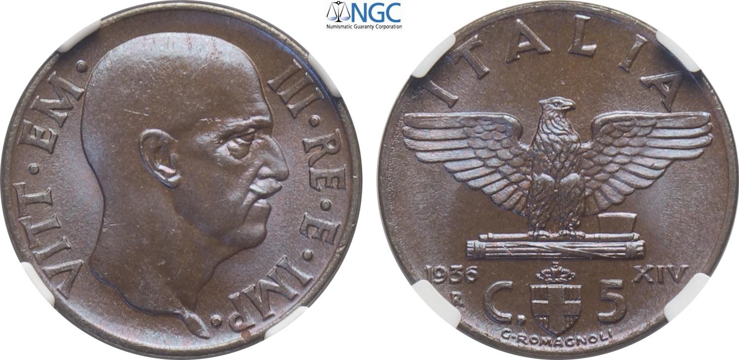 Regno d'Italia, Vittorio Emanuele III (1900-1943), 5 Centesimi 1936, Cu 19,5 mm, 3,25 g, in Slab NGC MS66 BN (only 1 coin is graded higher)