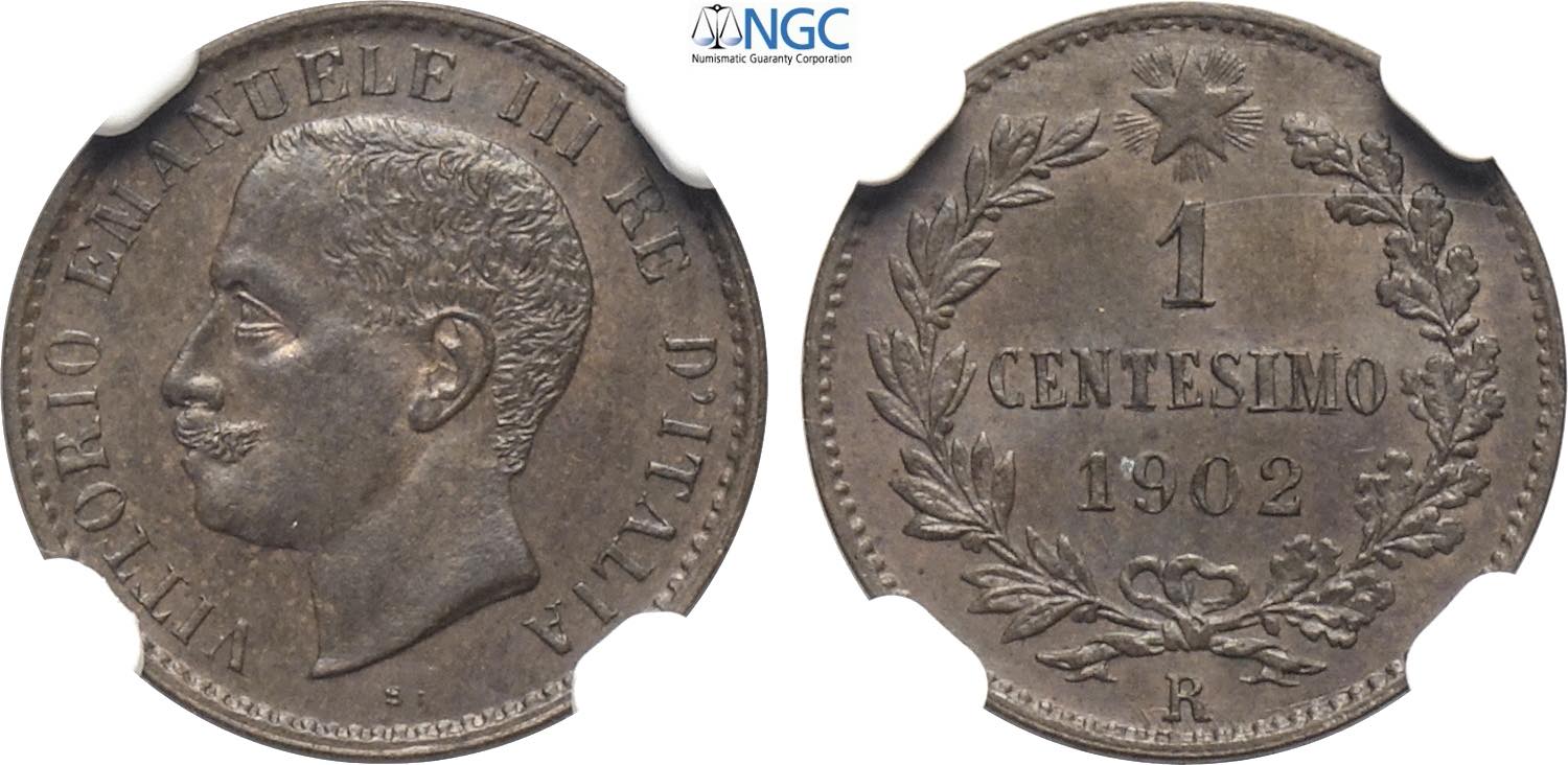 Regno d'Italia, Vittorio Emanuele III (1900-1943), Centesimo 1902, RRR Cu 15 mm, 1 g, in Slab NGC MS64 BN