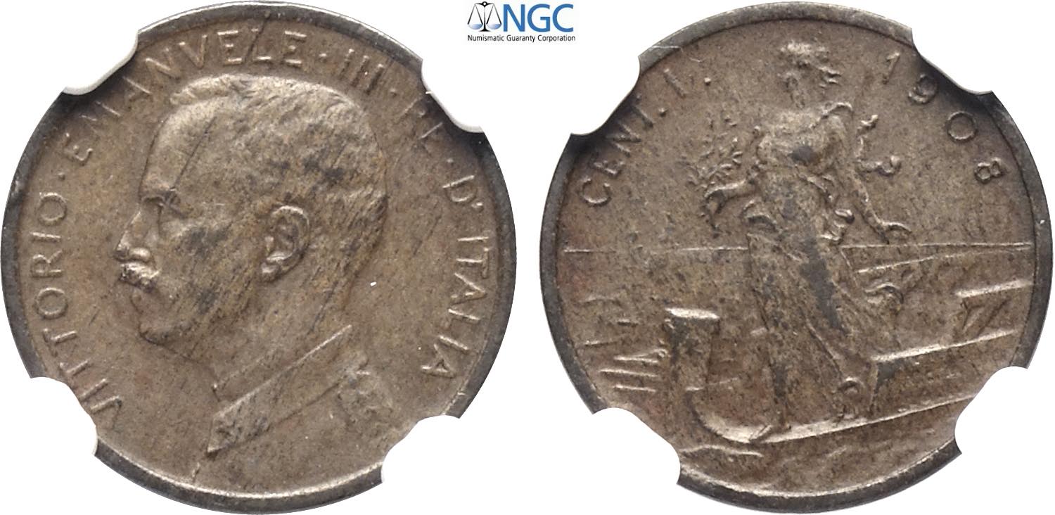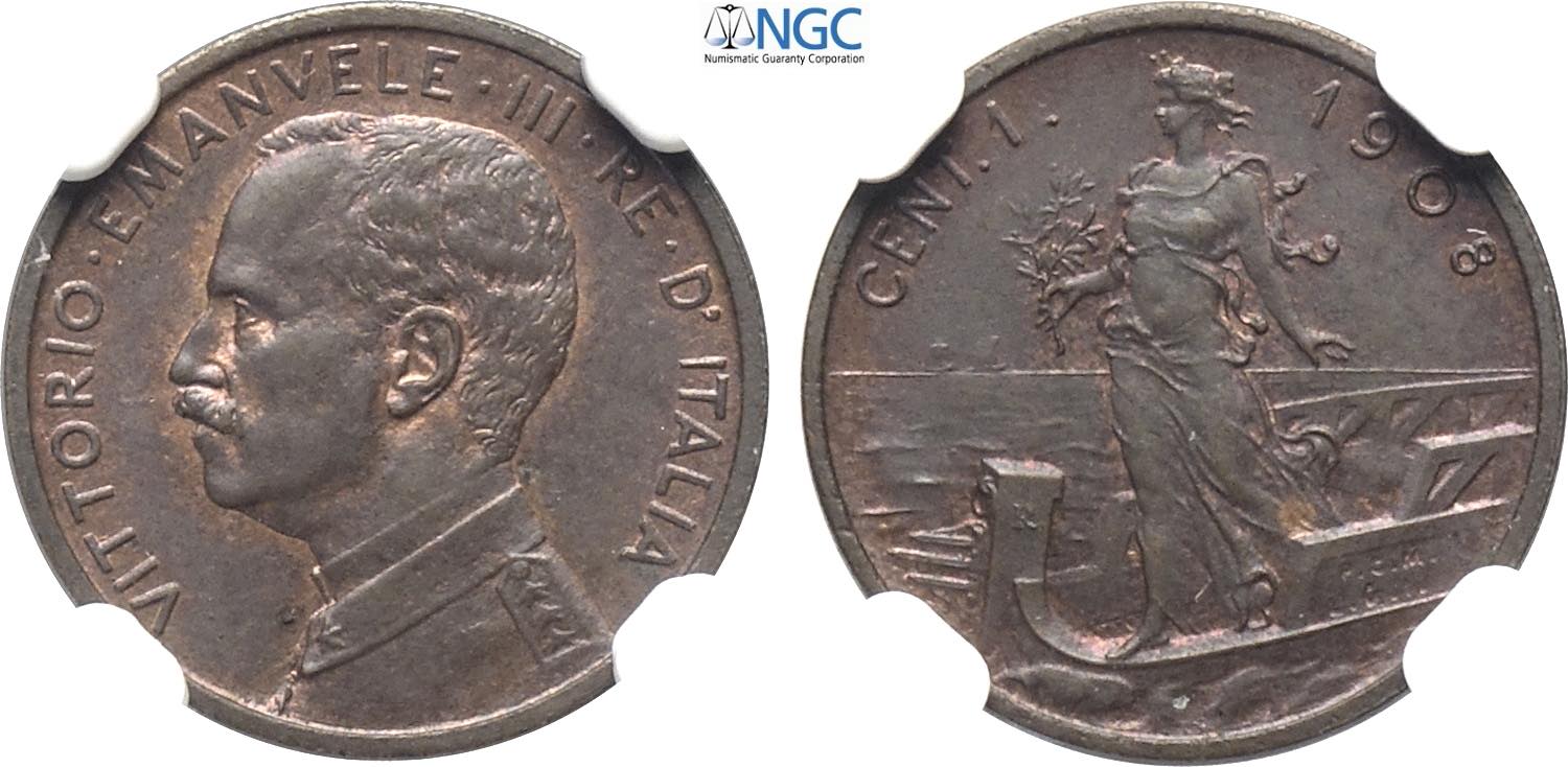 Regno d'Italia, Vittorio Emanuele III (1900-1943), Centesimo 1908 Italia su Prora, Rara Cu 15 mm, 1 g, in Slab NGC MS63 BN