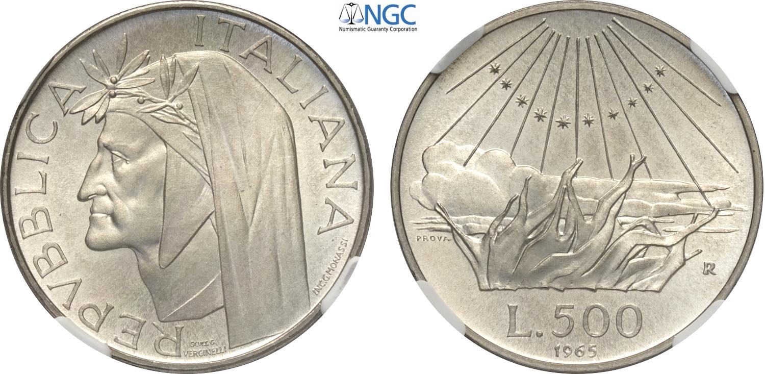 Repubblica Italiana, Monetazione in Lire (1946-2001), 500 Lire 1965 Prova, RR Ag 29 mm, 11 g, in Slab NGC MS65