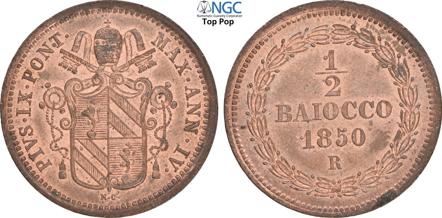 Roma, Pio IX (1846-1870), 1/2 Baiocco 1850-IV, Cu 24 mm, 5 g, in Slab NGC MS65 RB Top Pop (cert. 5785098006)