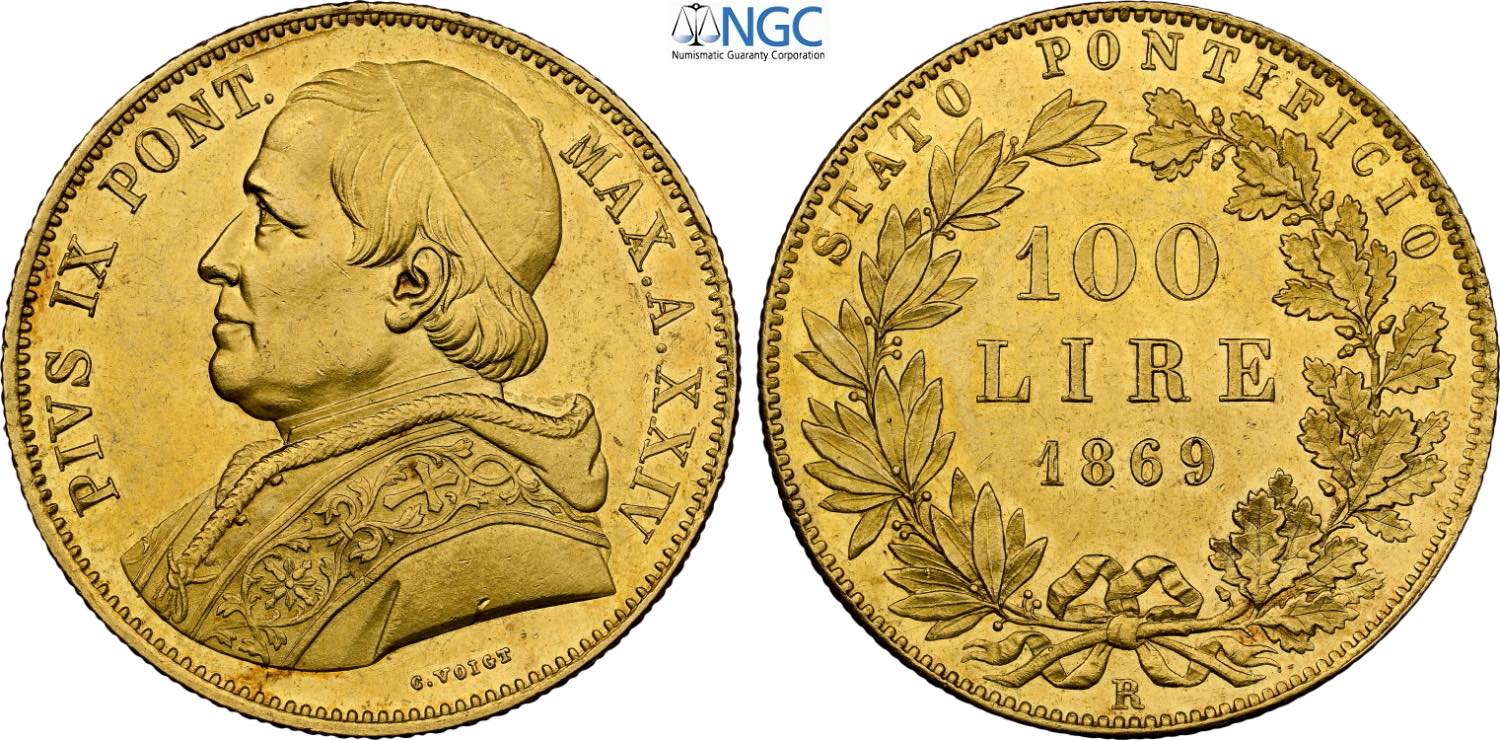Roma, Pio IX (1846-1870), 100 Lire 1869-XXIV, coniati 624 esemplari unitamente all'anno XXIII, RRRR Au 35,5 mm, 32,25 g, millesimo ...