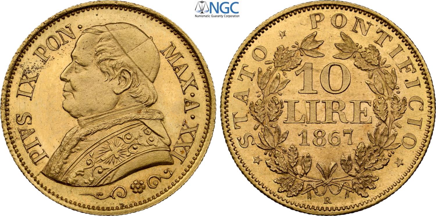 Roma, Pio IX (1846-1870), 10 Lire 1867-XXI, Rara Au 19,5 mm, 3,22 g, alta conservazione, in Slab NGC MS64