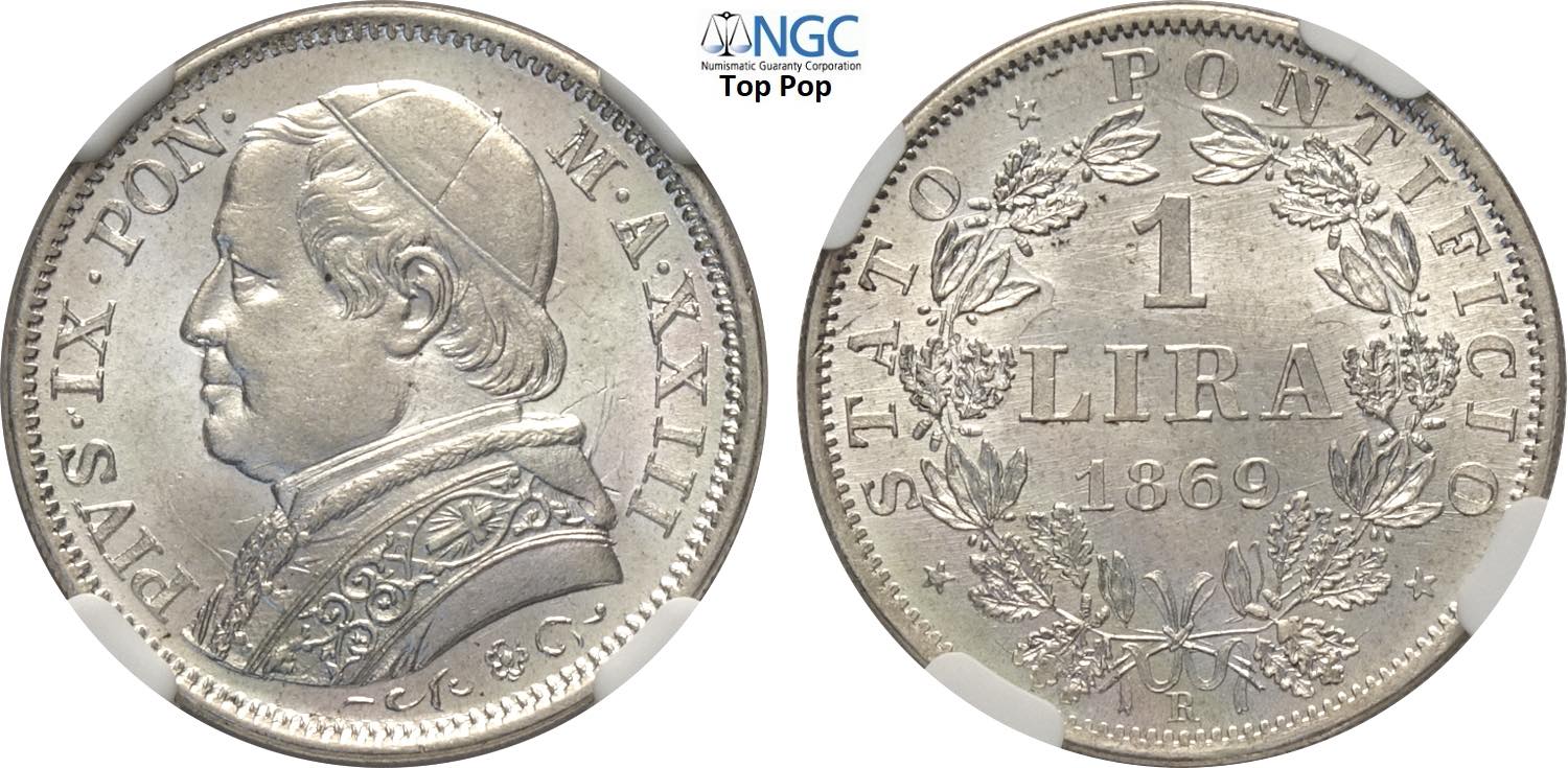 Roma, Pio IX (1846-1870), Lira 1869-XXIII, Ag 24 mm, 5 g, eccezionale, in Slab NGC MS66+ Top Pop (cert. 6643812020)