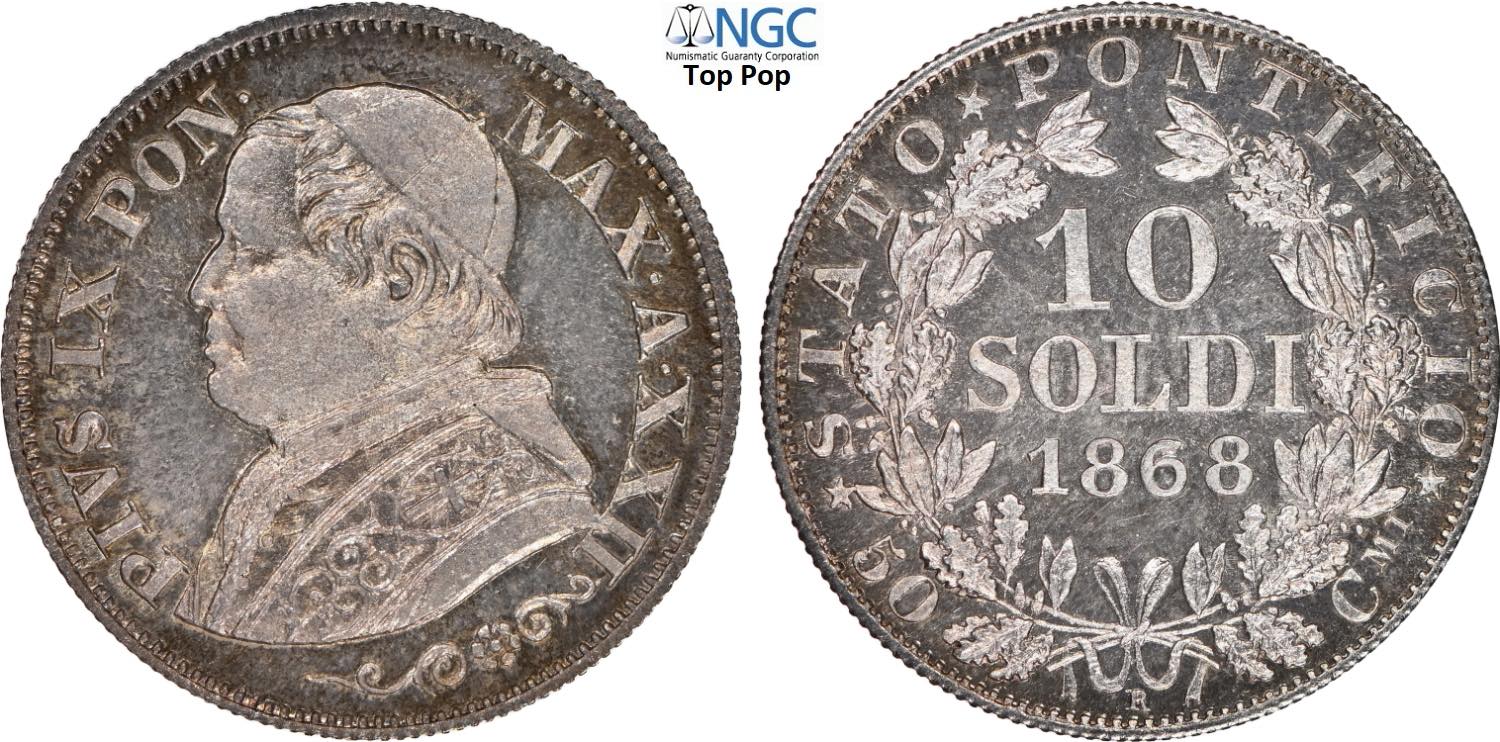 Roma, Pio IX (1846-1870), 10 Soldi da 50 Centesimi 1868-XXII, Ag 18,5 mm, 2,5 g, eccezionale con i fondi speculari, in Slab NGC MS66 PL Top ...