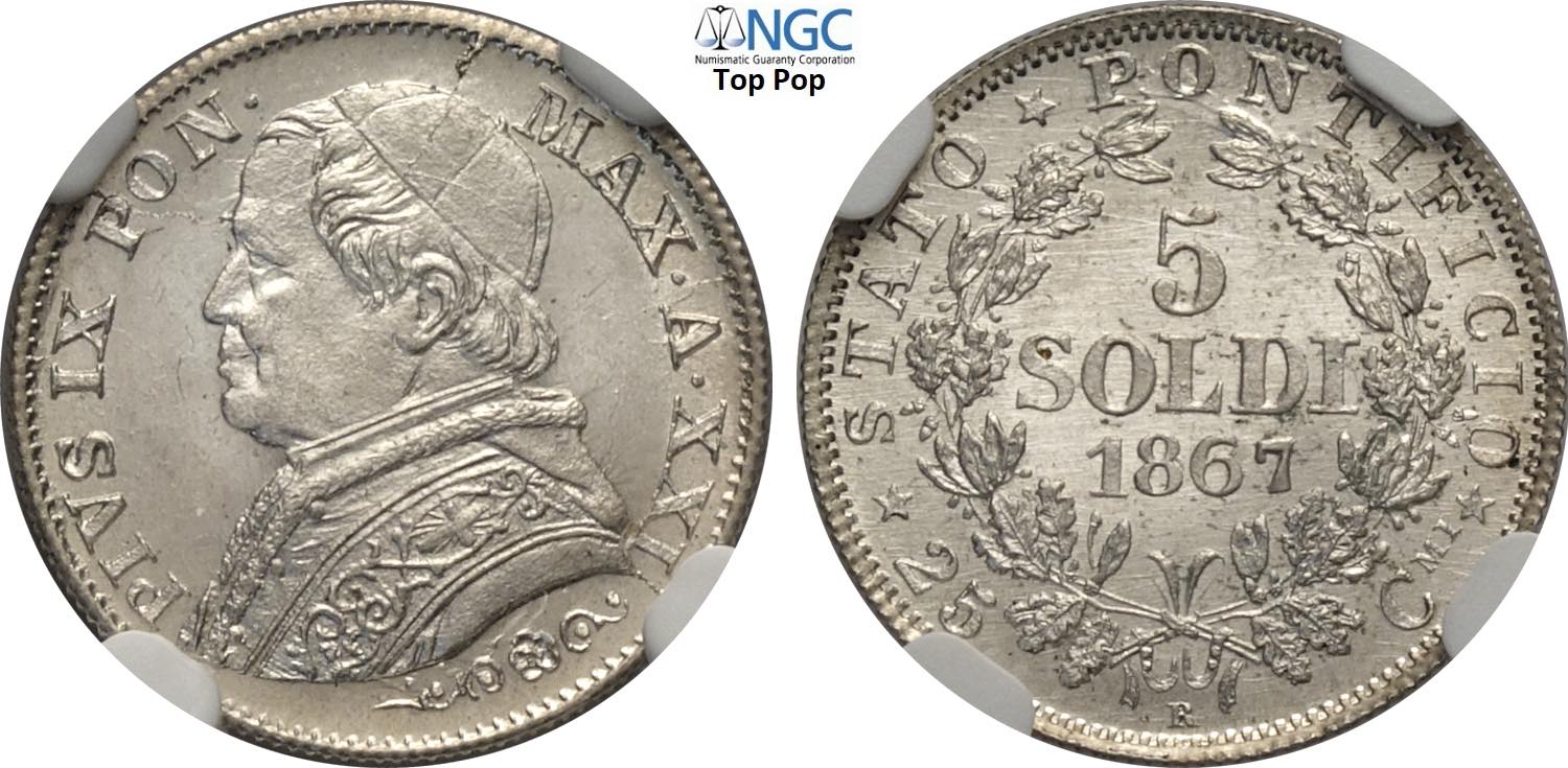 Roma, Pio IX (1846-1870), 5 Soldi da 25 Centesimi 1867-XXI, Ag 16,2 mm, 1,25 g, eccezionale, in Slab NGC MS66 Top Pop (cert. 6647151020)