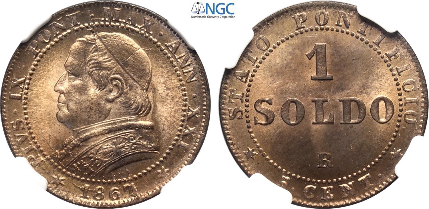 Roma, Pio IX (1846-1870), Soldo da 5 Centesimi 1867-XXI, Cu 26 mm, 5 g, eccezionale in rame rosso, in Slab NGC MS65 RD