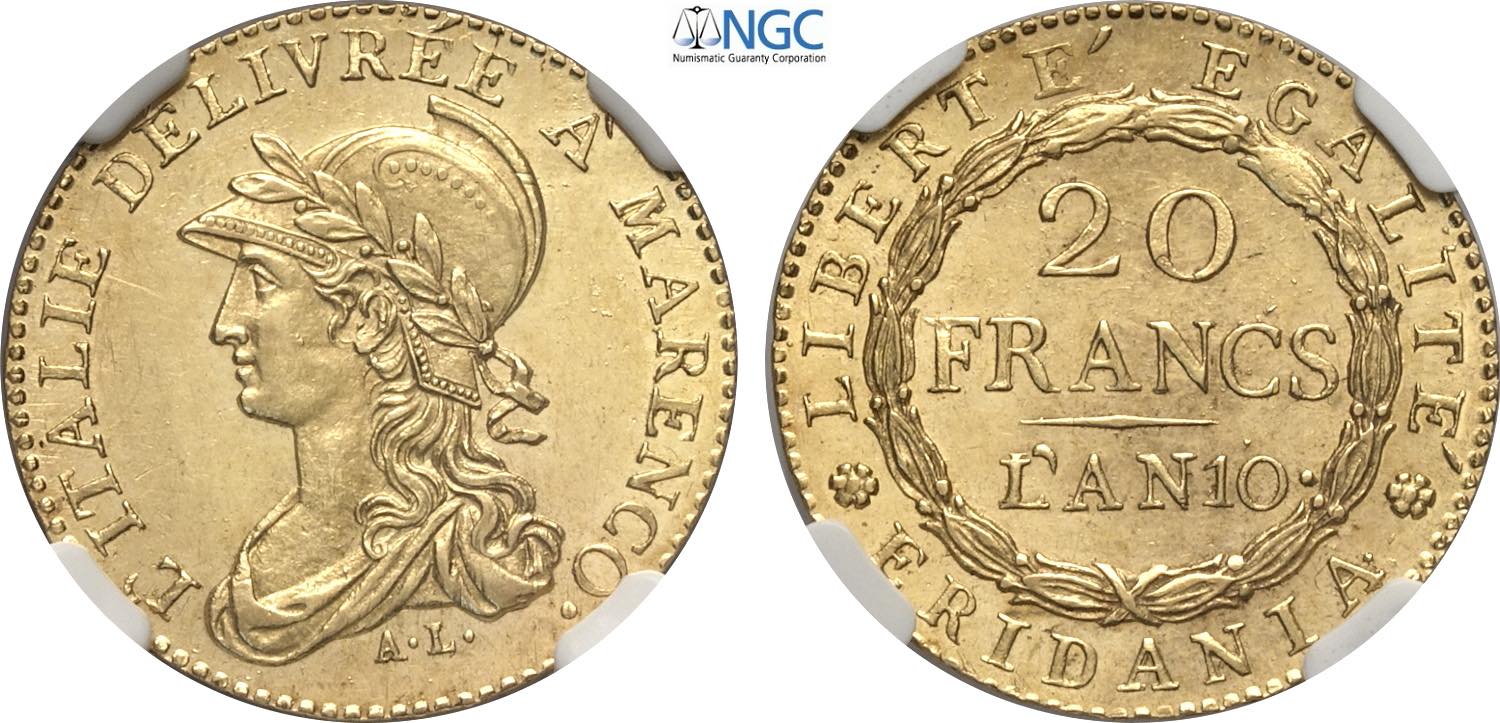 Torino, Repubblica Subalpina (1800-1802), 20 Franchi l'An 10, Rara Au 22 mm, 6,45 g, di conservazione eccezionale per il tipo con pieno ...
