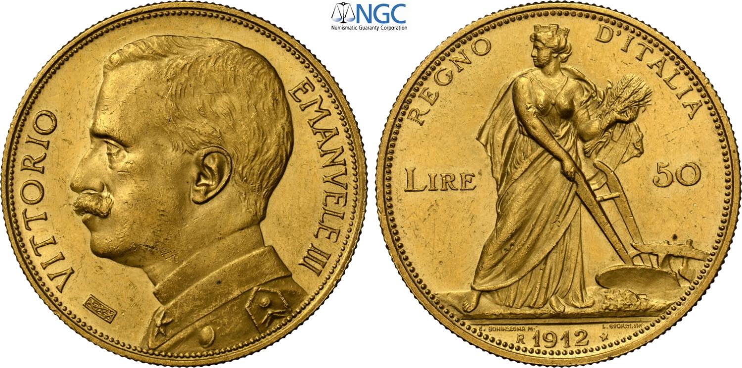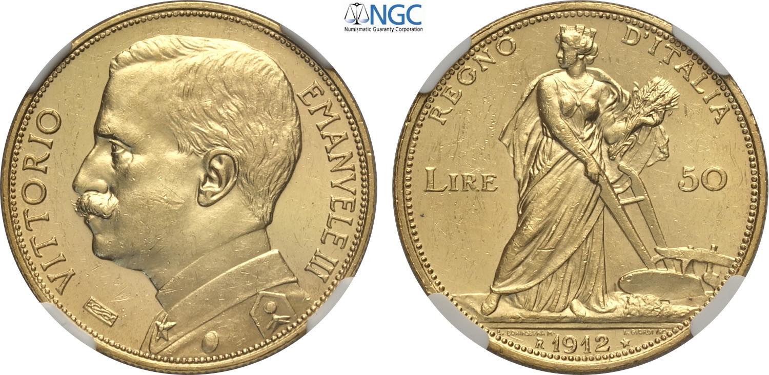 Regno d'Italia, Vittorio Emanuele III (1900-1943), 50 Lire 1912, Rara Au 28 mm, 16,13 g, in Slab NGC MS62