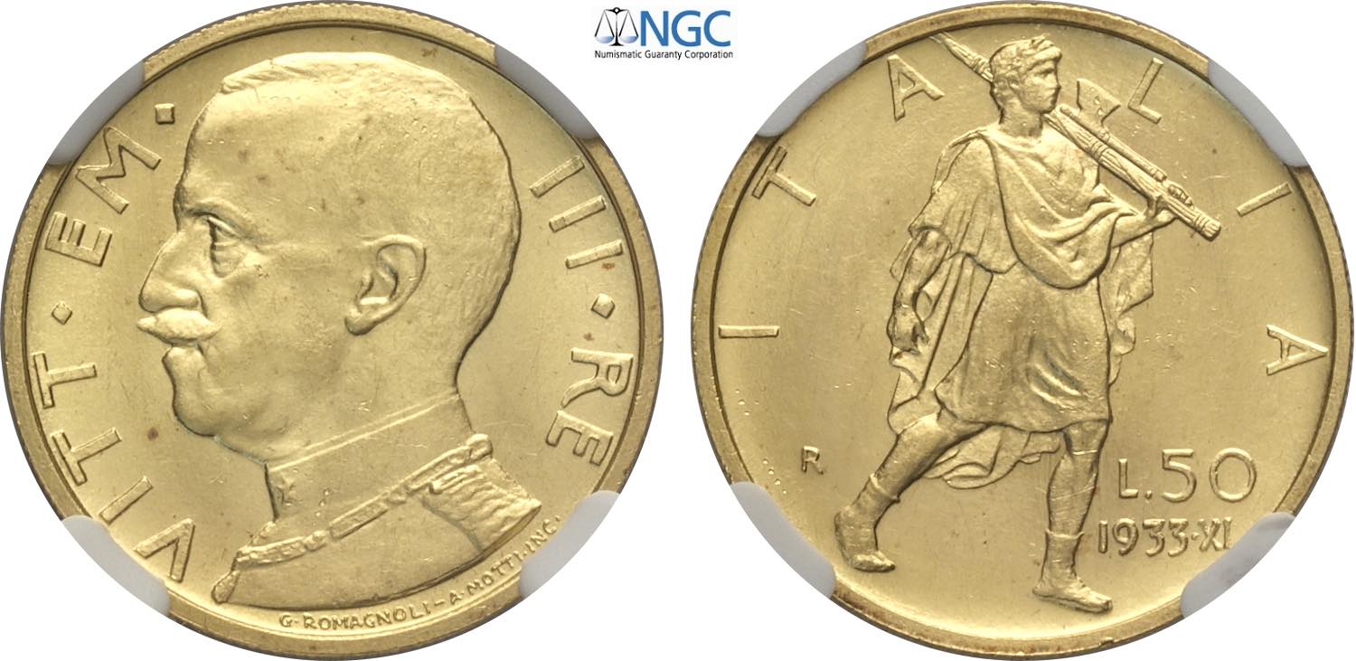 Regno d'Italia, Vittorio Emanuele III (1900-1943), 50 Lire 1933, Rara Au 20,5 mm, 4,4 g, in Slab NGC MS63