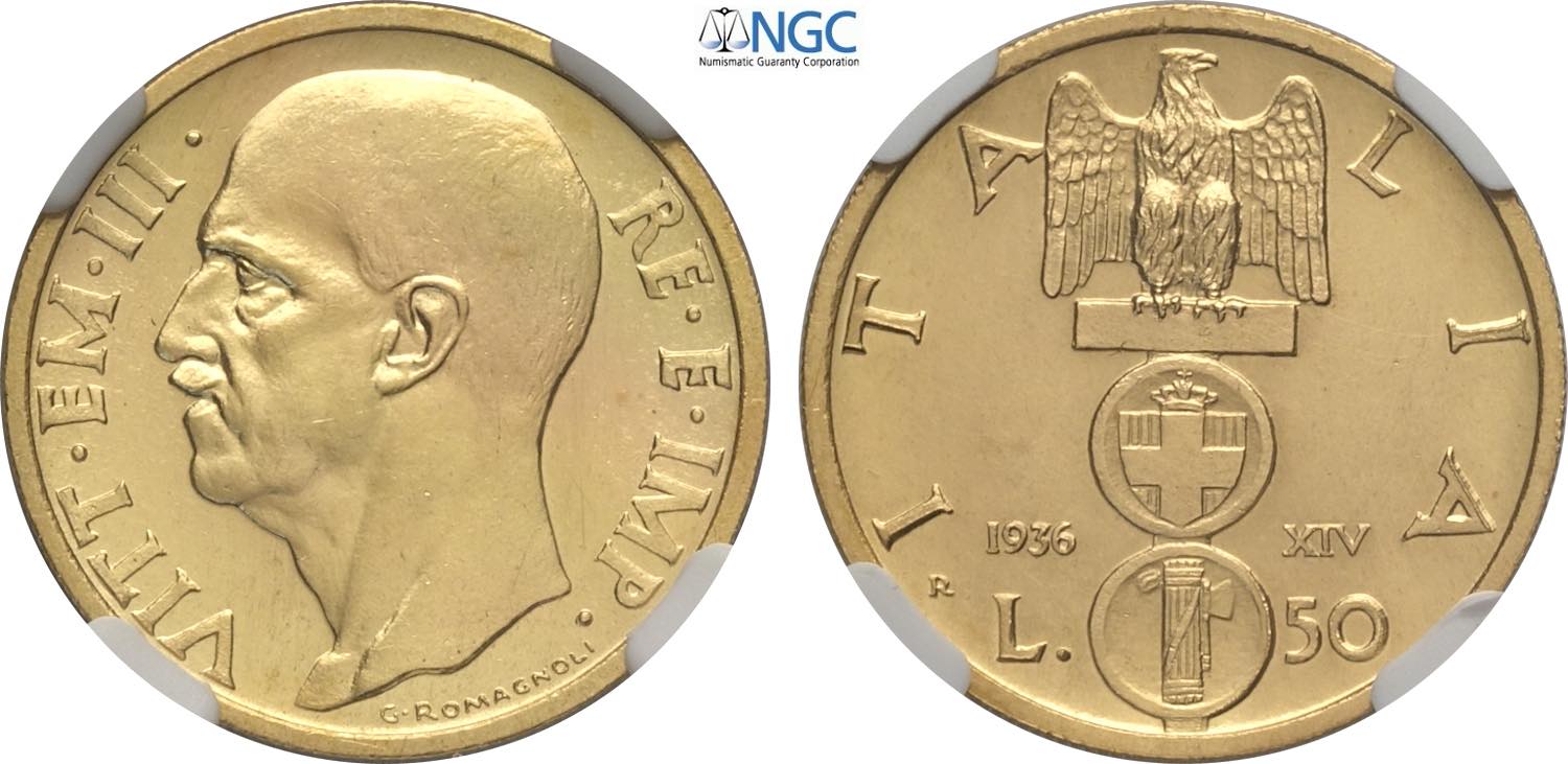 Regno d'Italia, Vittorio Emanuele III (1900-1943), 50 Lire 1936, coniati 790 esemplari, RR Au 20,5 mm, 4,4 g, in Slab NGC UNC-cleaned ...