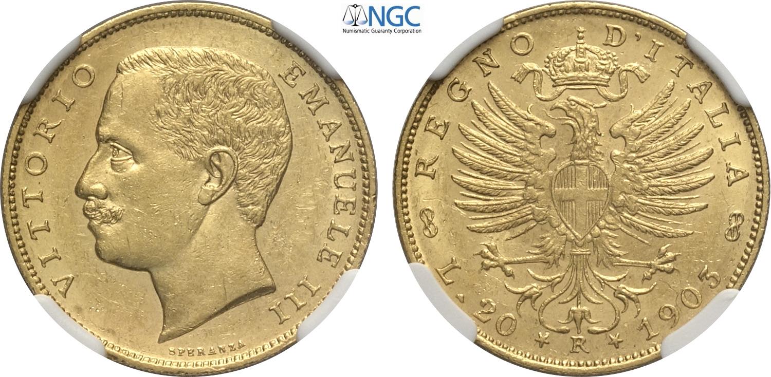 Regno d'Italia, Vittorio Emanuele III (1900-1943), 20 Lire 1905, Rara Au 21 mm, 6,45 g, in Slab NGC MS63