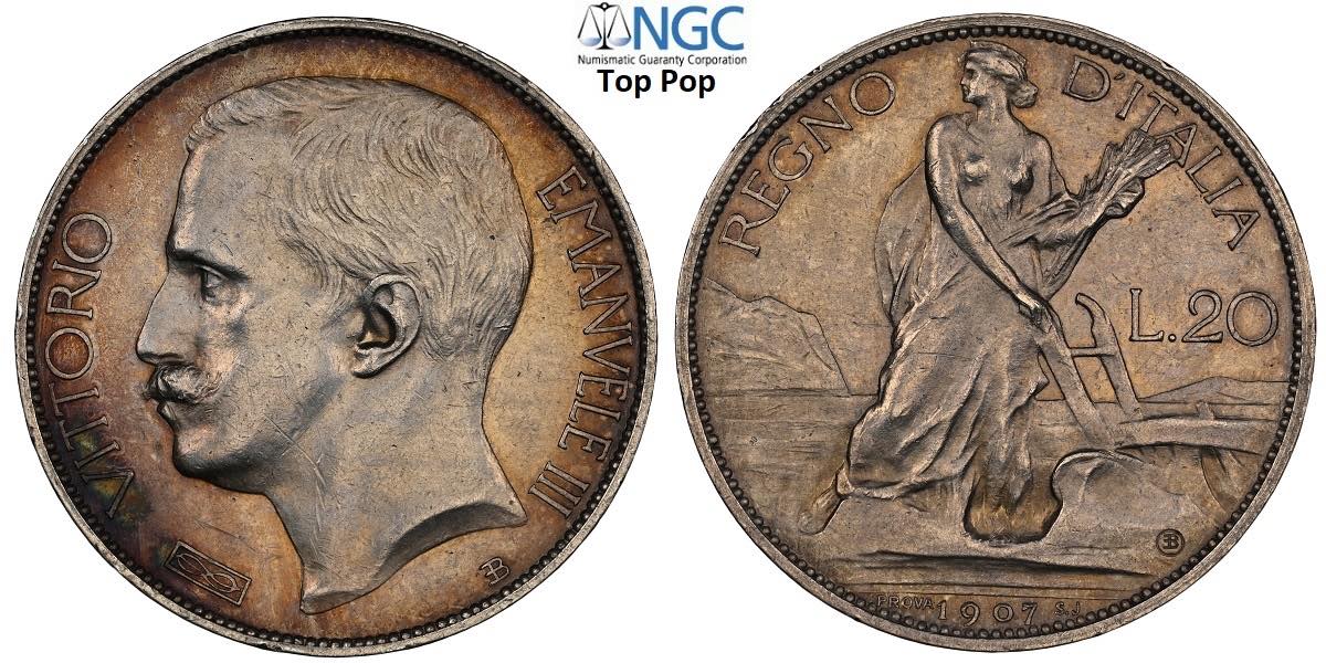 Regno d'Italia, Vittorio Emanuele III (1900-1943), 20 Lire 1907 Prova in argento, Pag-182 RRRR Ag 21 mm, 3,5 g, prova di grande rarità non ...