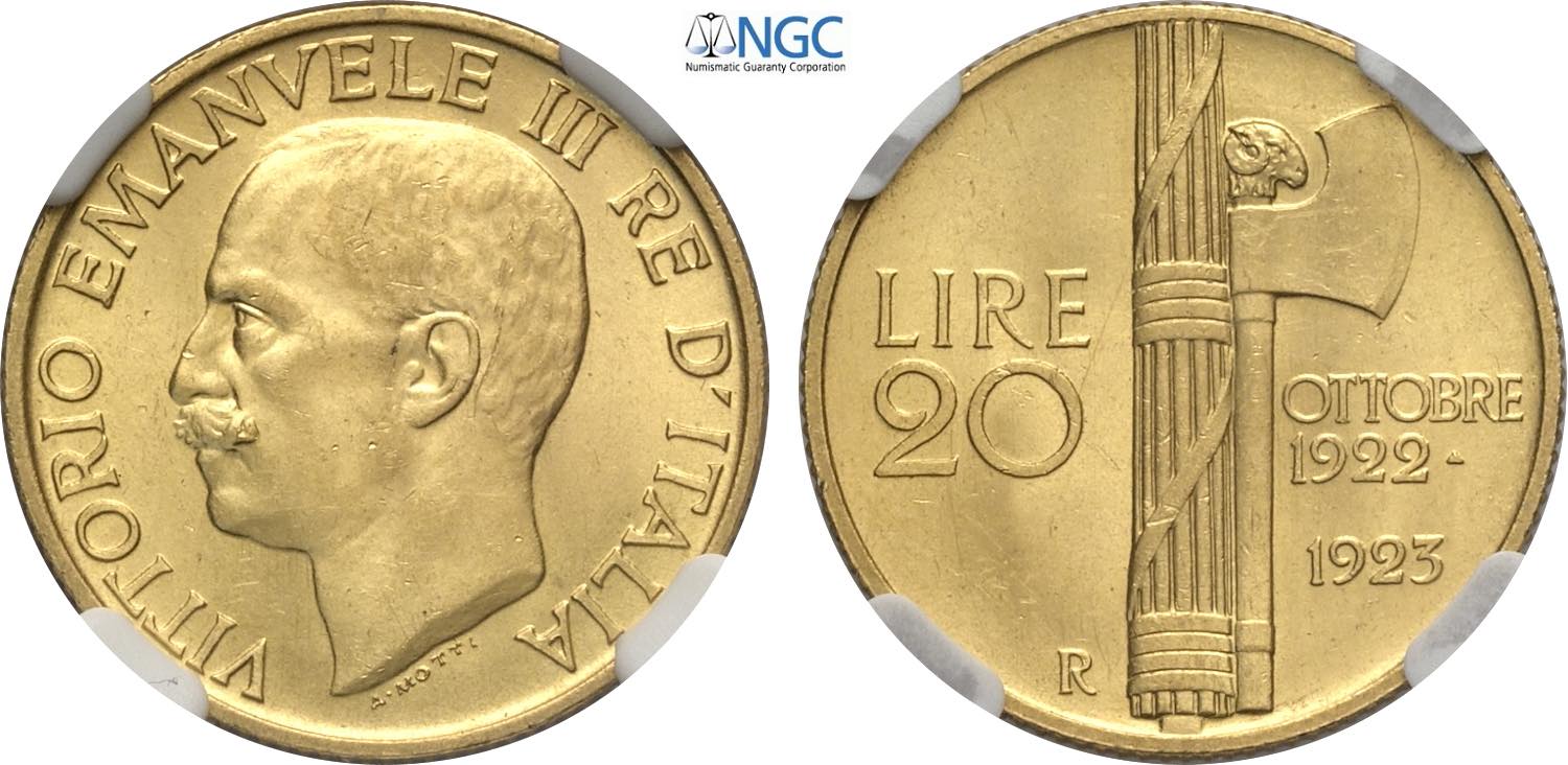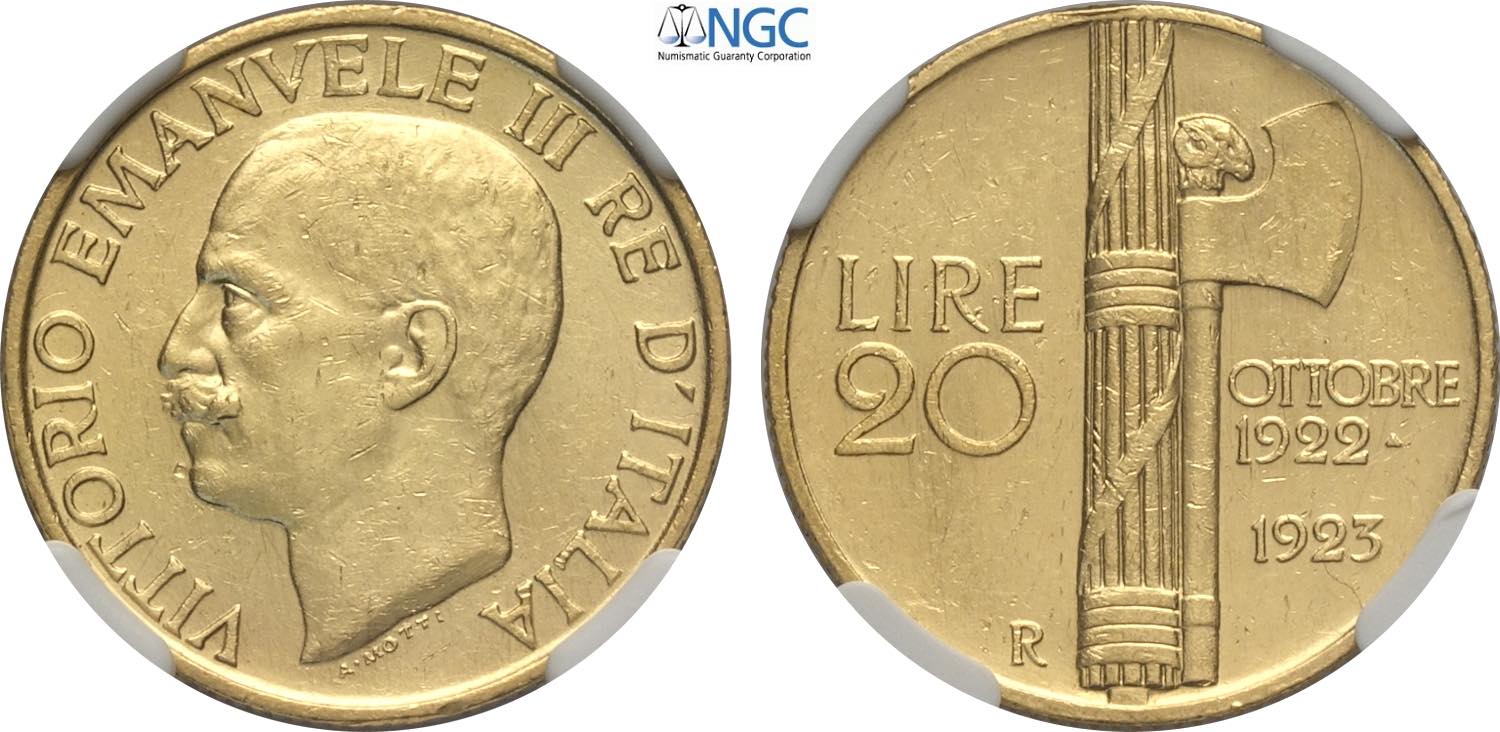 Regno d'Italia, Vittorio Emanuele III (1900-1943), 20 Lire 1923, Rara Au 21 mm, 6,45 g, di gran qualità, in Slab NGC MS63