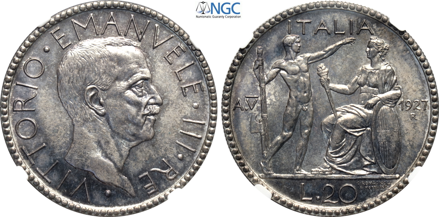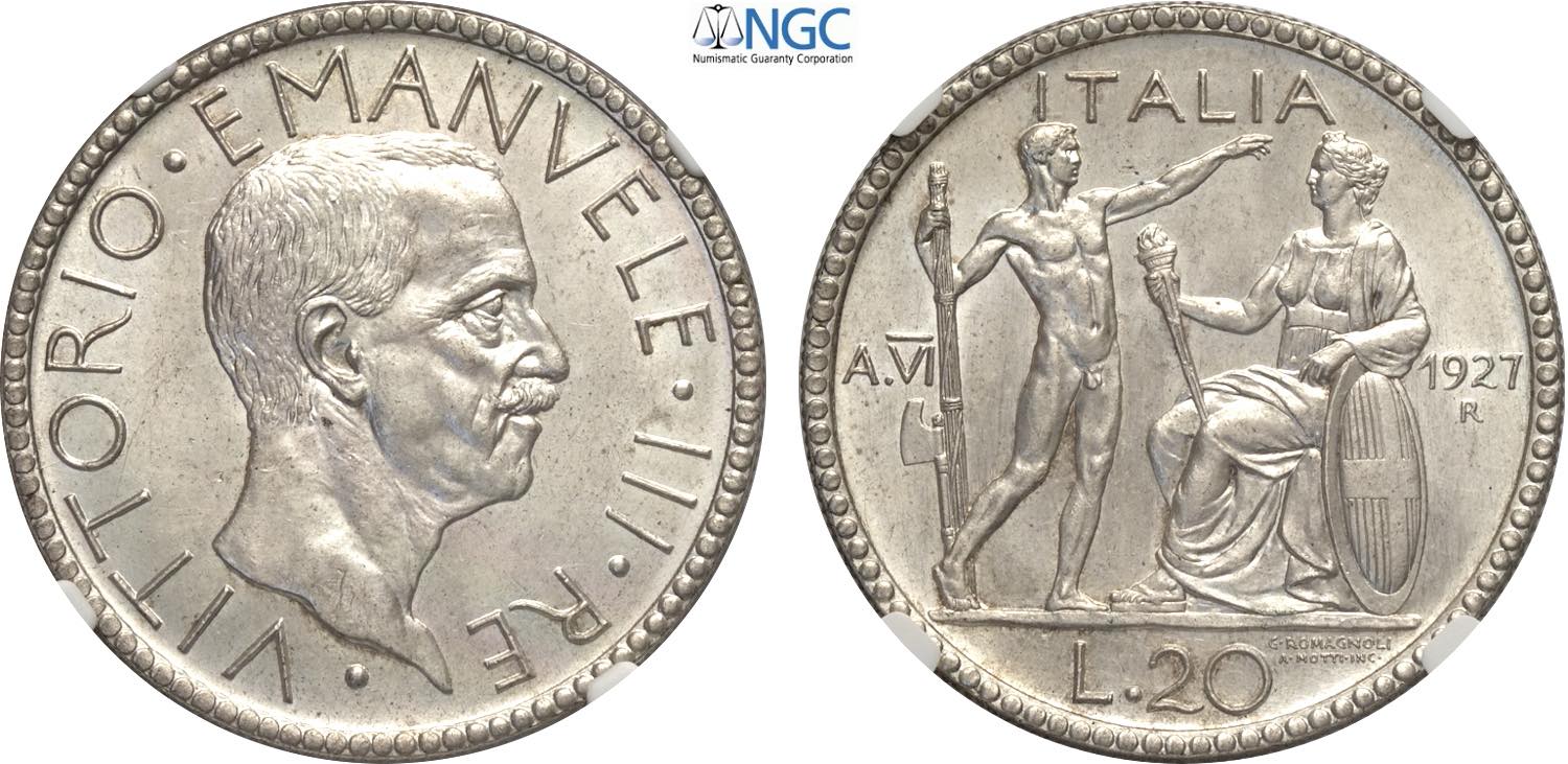 Regno d'Italia, Vittorio Emanuele III (1900-1943), 20 Lire 1927-VI, Ag 35,5 mm, 15 g, in Slab NGC MS63