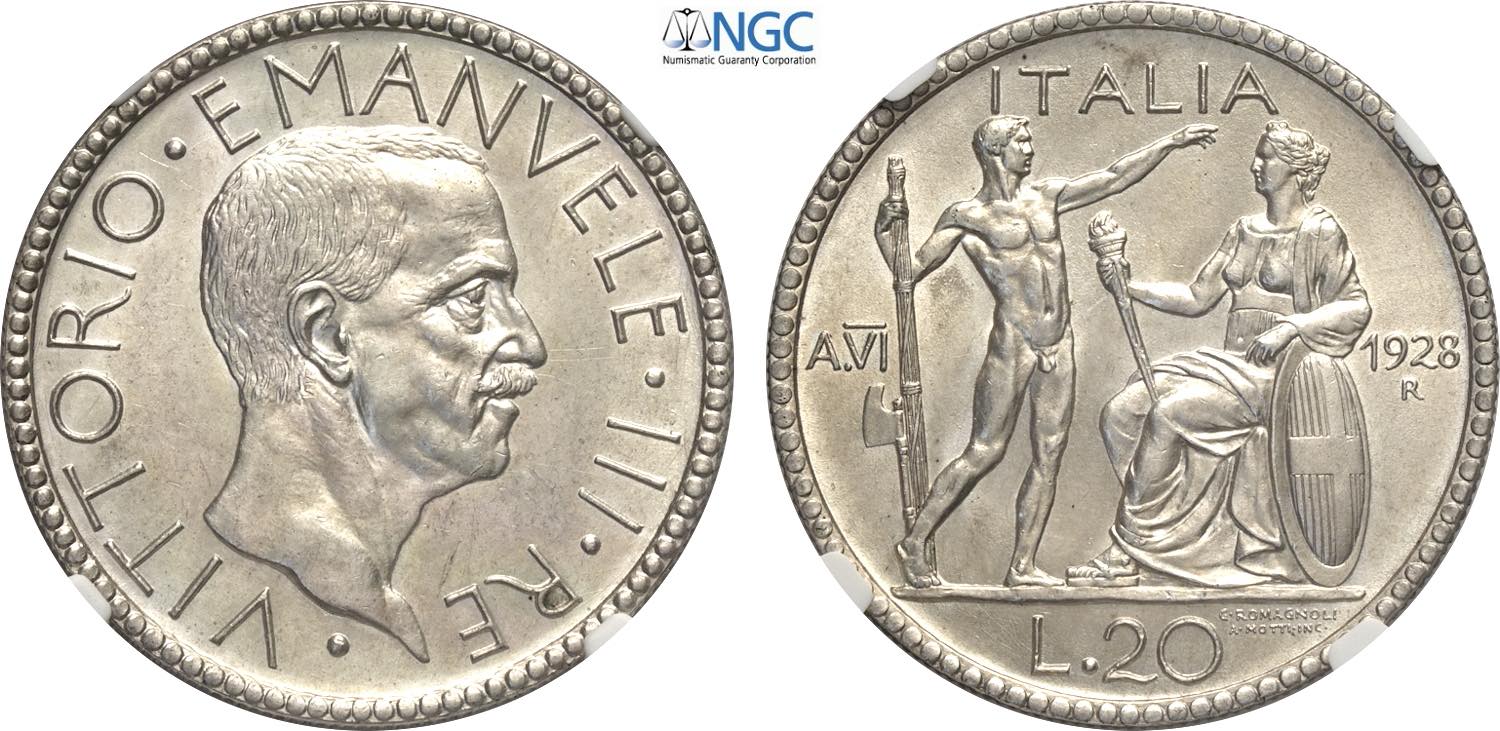 Regno d'Italia, Vittorio Emanuele III (1900-1943), 20 Lire 1928 Littore, Ag 35,5 mm, 15 g, in Slab NGC MS61