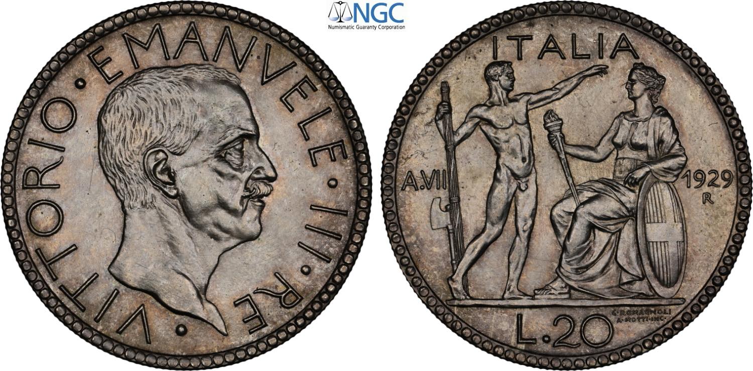 Regno d'Italia, Vittorio Emanuele III (1900-1943), 20 Lire 1929, coniati 50 esemplari, RRR Ag 35,5 mm, 15 g, in Slab NGC MS64