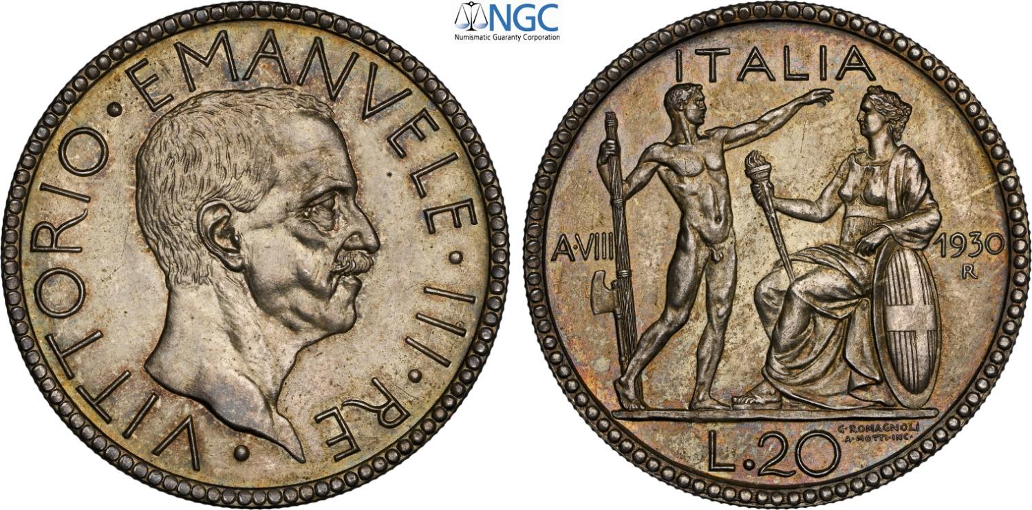 Regno d'Italia, Vittorio Emanuele III (1900-1943), 20 Lire 1930, coniati 50 esemplari, RRR Ag 35,5 mm, 15 g, in Slab NGC MS65