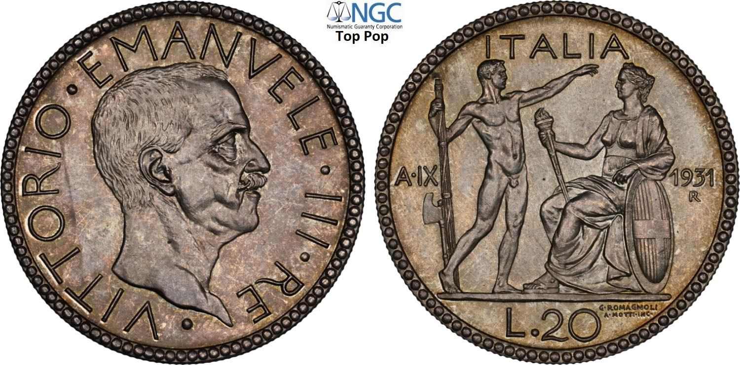 Regno d'Italia, Vittorio Emanuele III (1900-1943), 20 Lire 1931, coniati 50 esemplari, RRR Ag 35,5 mm, 15 g, eccezionale, in Slab NGC MS66 ...