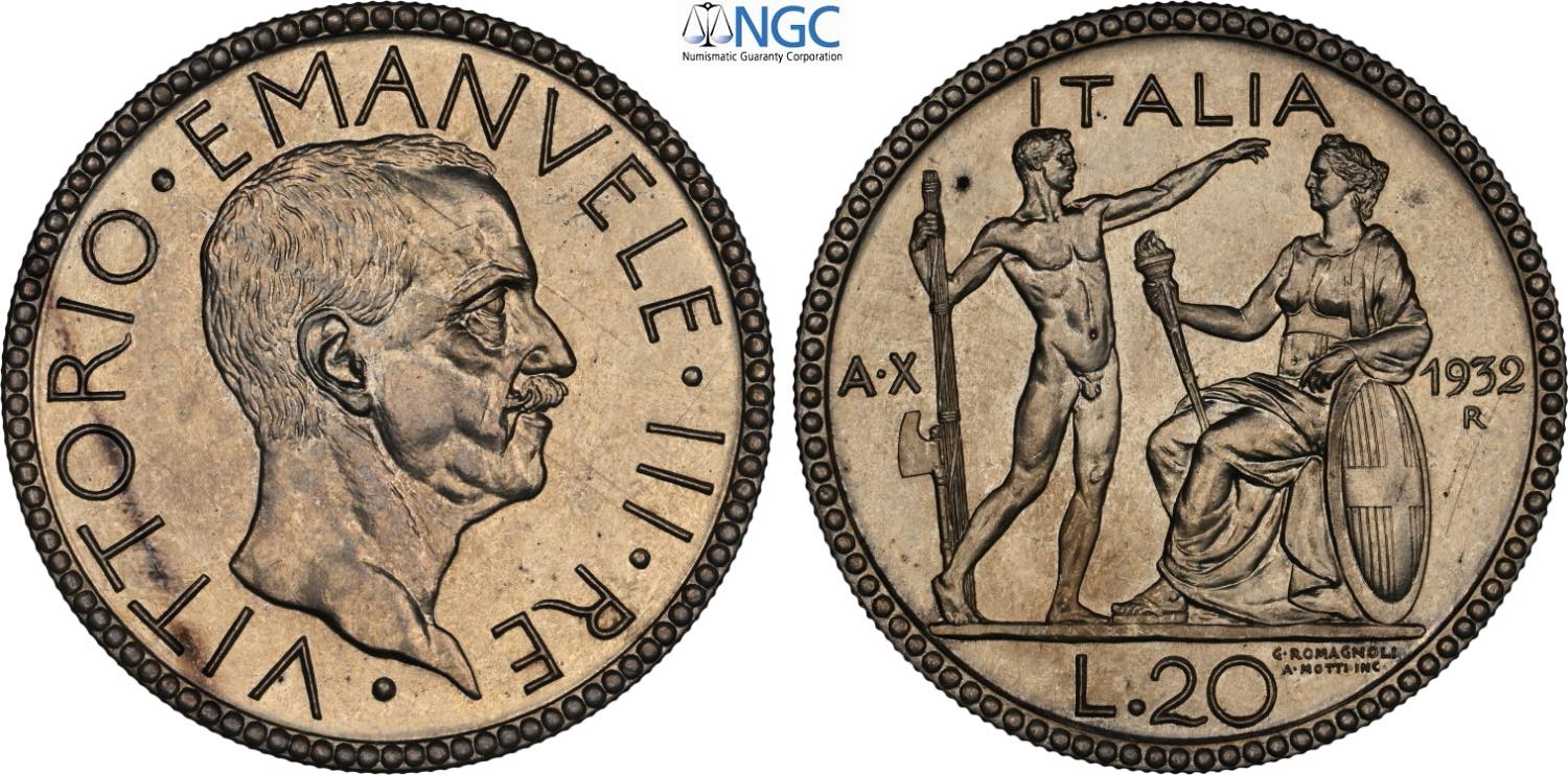 Regno d'Italia, Vittorio Emanuele III (1900-1943), 20 Lire 1932, coniati 50 esemplari, RRR Ag 35,5 mm, 15 g, in Slab NGC MS65