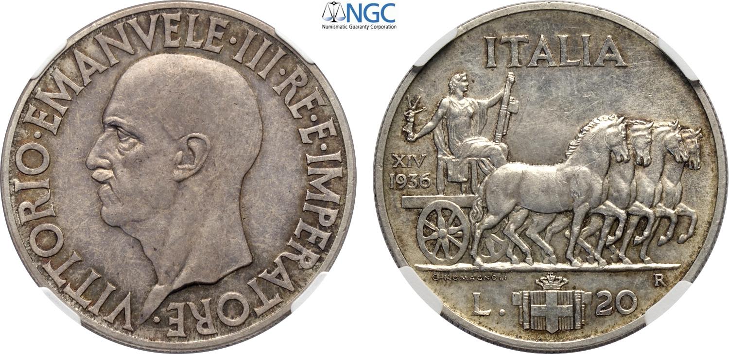 Regno d'Italia, Vittorio Emanuele III (1900-1943), 20 Lire 1936, Rara Ag 35,5 mm, 20 g, in Slab NGC MS61