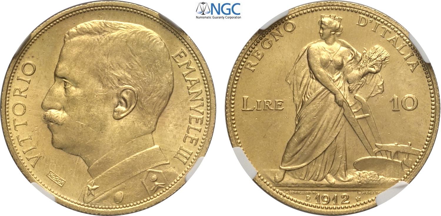 Regno d'Italia, Vittorio Emanuele III (1900-1943), 10 Lire 1912, RRR Au 19 mm, 3,22 g, in Slab NGC MS63